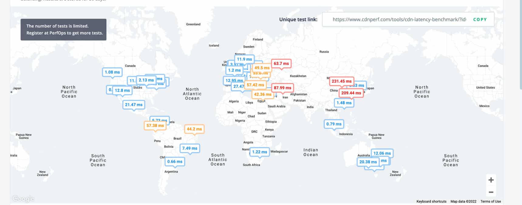With the Cloudflare free CDN, you will find that the latency is quite high in regions like US (11.57 ms), Mexico (21.47 ms), etc. The locations marked in red show high latency.