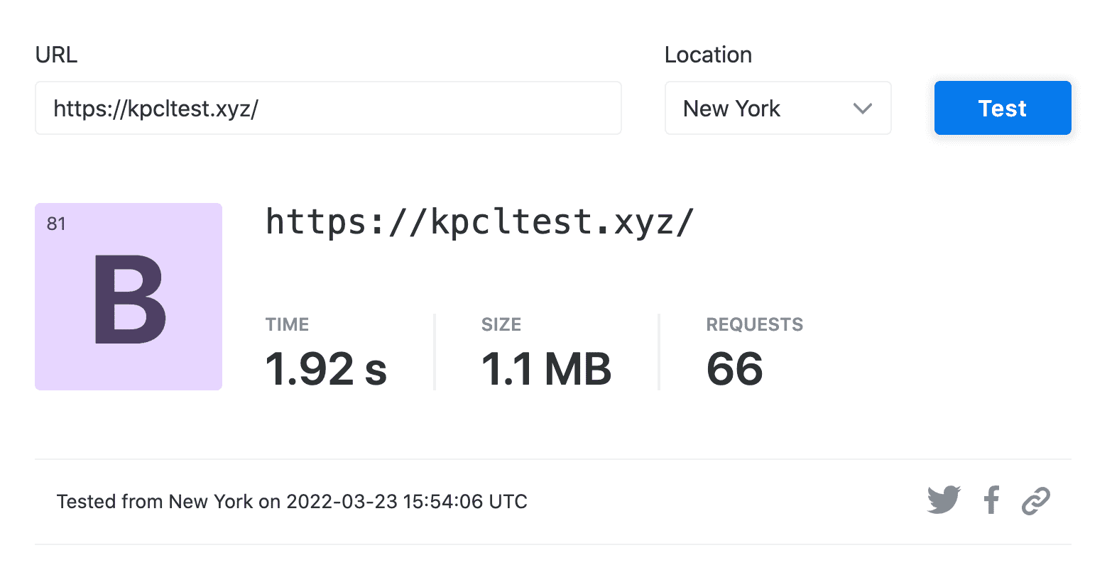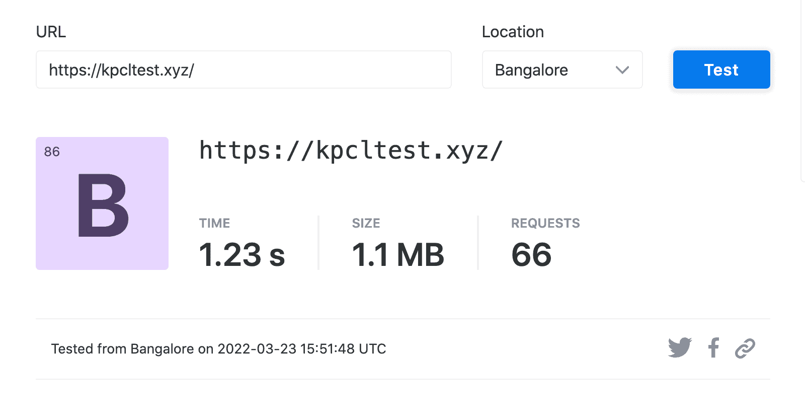 For conducting the speed test, I have used my website https://kpcltest.xyz hosted on Cloudways hosting with Singapore servers. I have conducted speed tests in two different conditions: