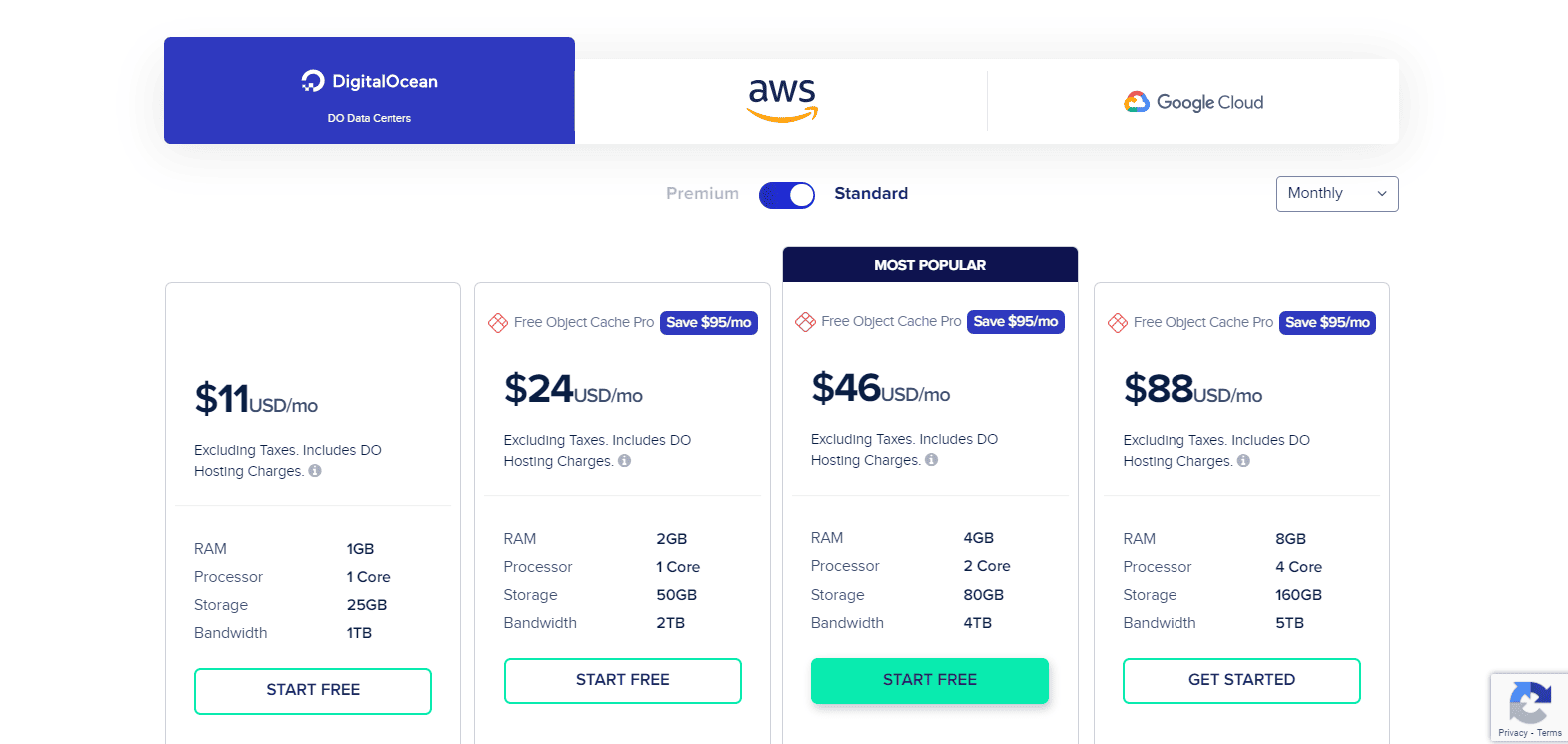There are dozens of different pricing plans on Cloudways, but if you go with the most popular Digital Ocean servers, you will find the following plans.