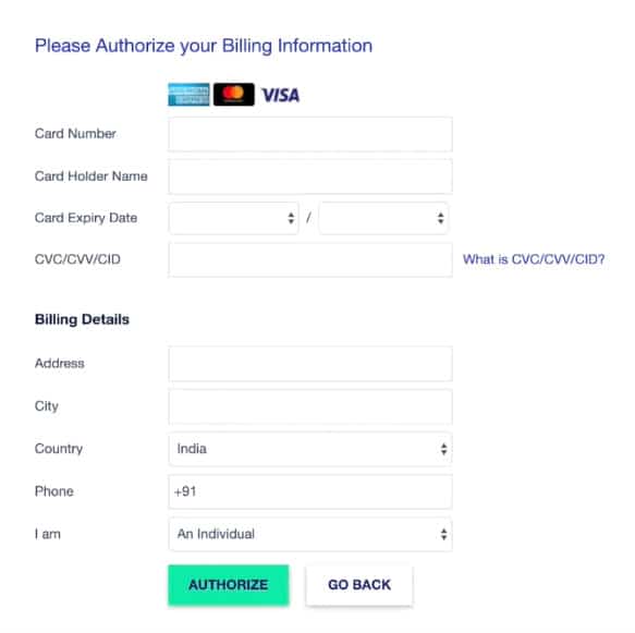 Once your server is created, click on ‘Upgrade your Account’. Then, enter your card details and billing address, and click on ‘Authorize’.