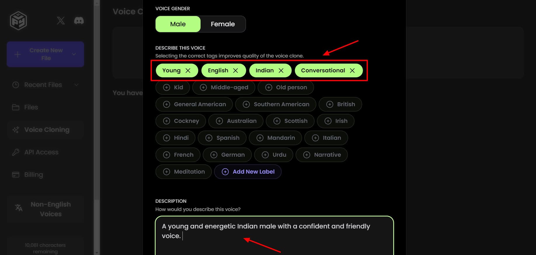Give this audio a name and choose a gender. Then, you can pick a few labels from their list that best describe your voice and also write a more descriptive version below it.