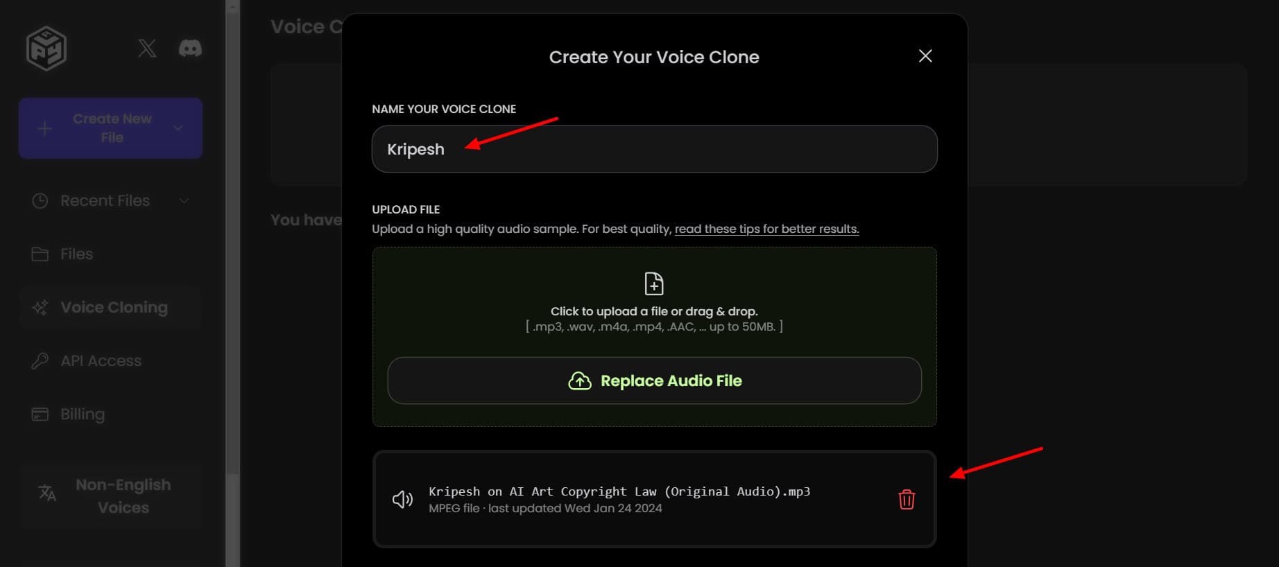 For the Instant Voice Clone, you’ll have to upload a clear and high-quality audio sample at least 30 seconds long.