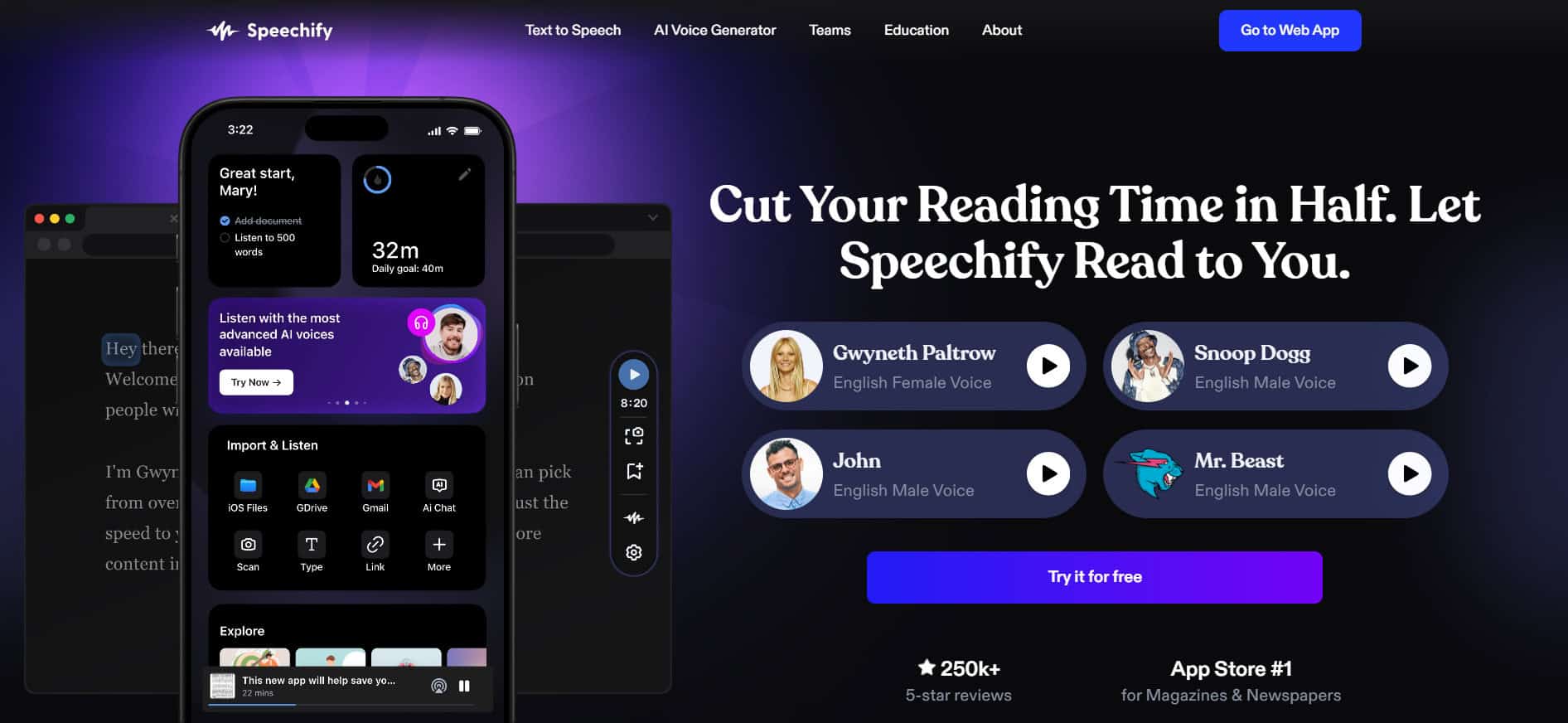 Speechify is one of the best AI text-to-speech apps. It features a library of 200+ AI voices in 50 different languages. Besides AI voice generation, it also features an AI voice cloning tool. But it’s only available on the Professional plan for $99/month.