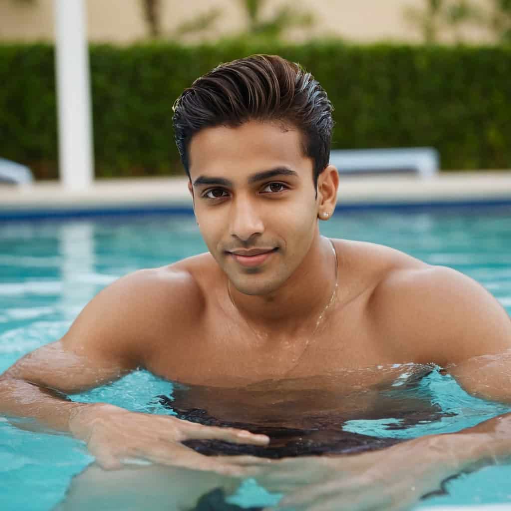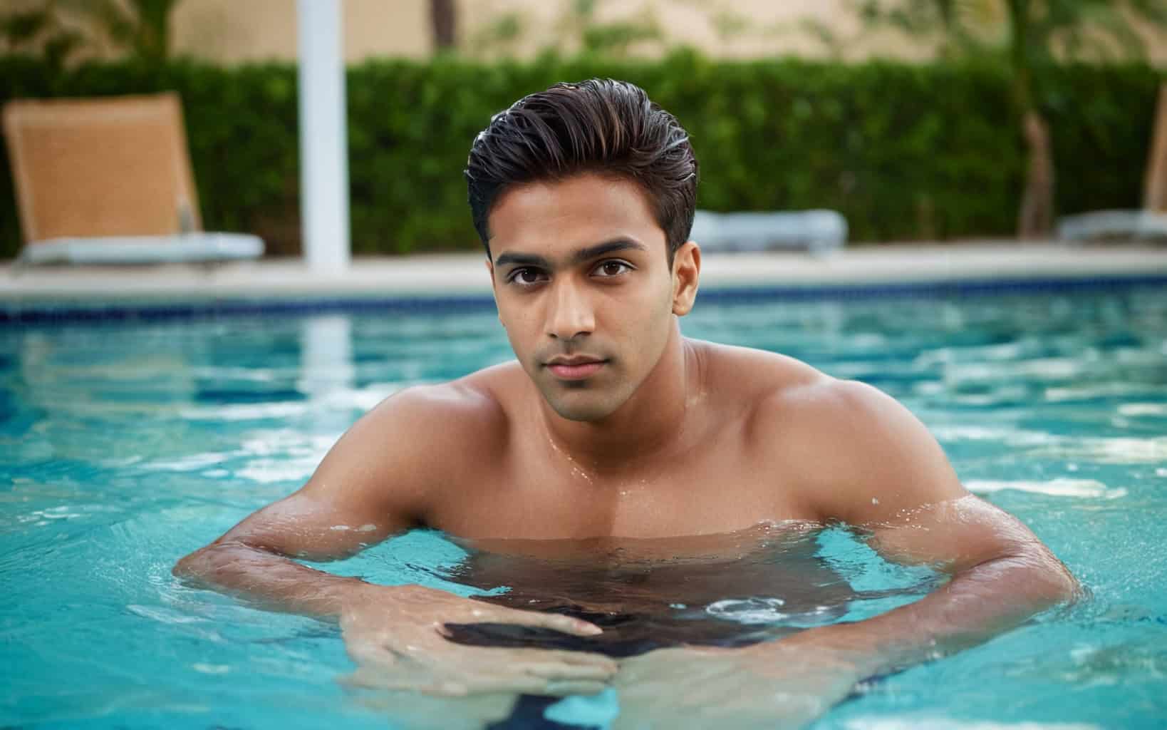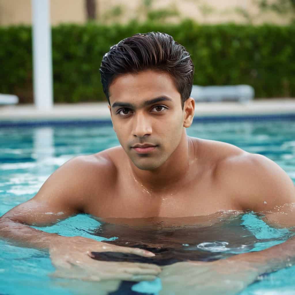 “An Indian guy with a light skin tone. Good-looking face, good-looking eyes, good hairstyle. Show him swimming in a pool.”