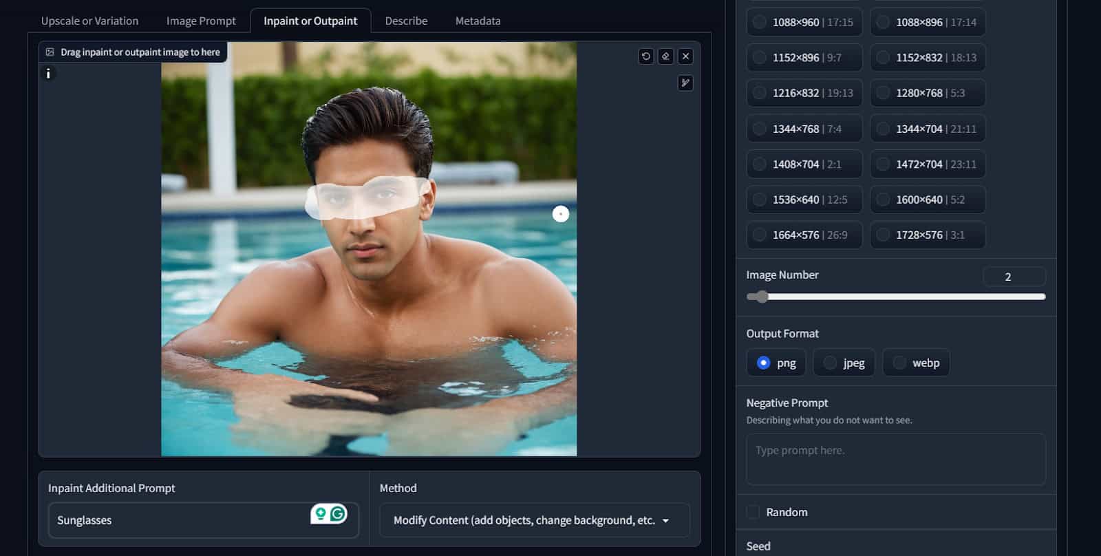 Fooocus allows you to insert or remove any objects from your AI influencer’s image. For instance, if we want our AI influencer to wear sunglasses, we will follow the steps given below.