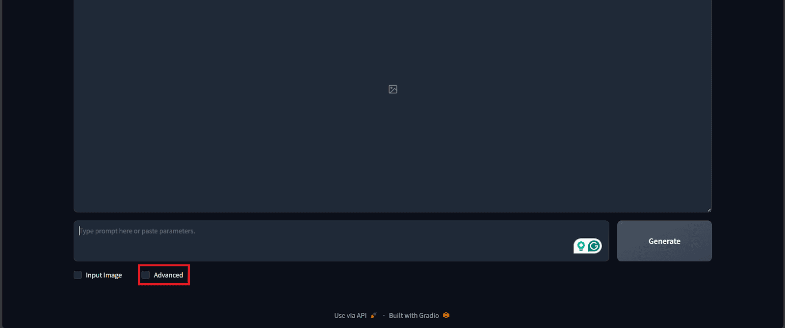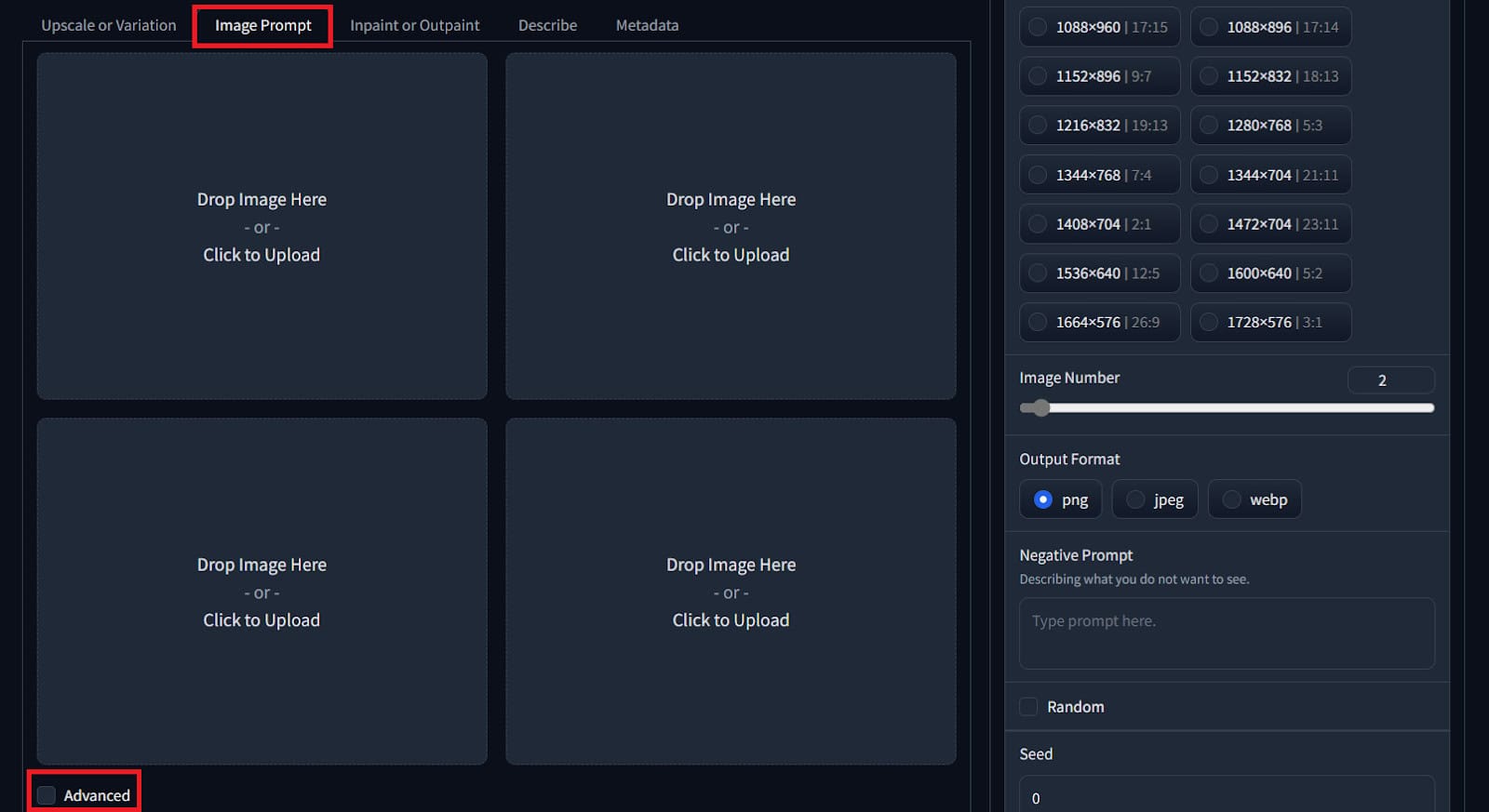 - First of all, check the Advanced tab to load the Settings. Without enabling the Advanced settings, the interface only displays the option to enter your prompt.