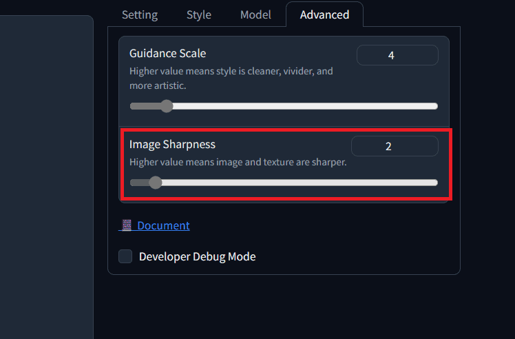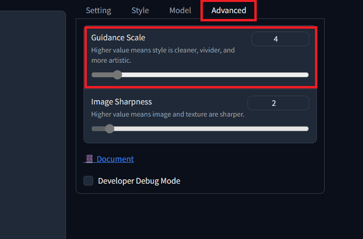 - Next, head over to the Advanced tab. Move the Guidance Scale slider to the right to get a cleaner image. Else move the slider to the left.