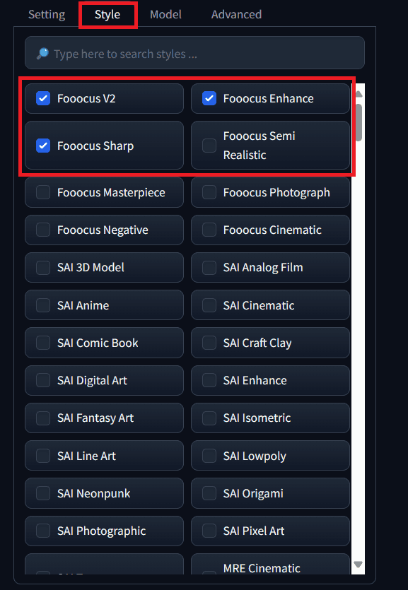 - Head over to the Style tab now. By default, the Fooocus V2, Fooocus Enhance, and Fooocus Sharp options will be checked. Leave them unchanged.