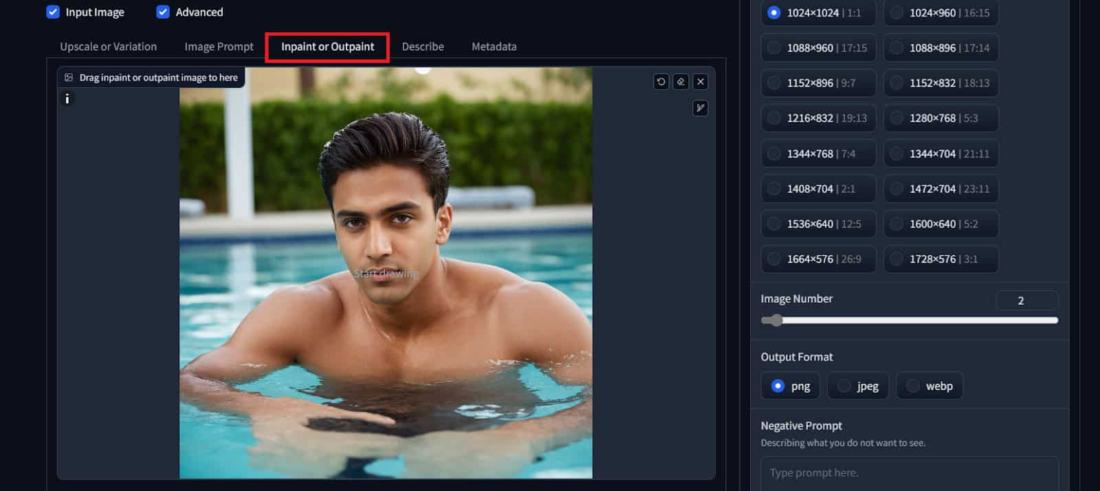 - Click on the Inpaint or Outpaint tab. Drag and drop or upload the image of your AI influencer on the dashboard.