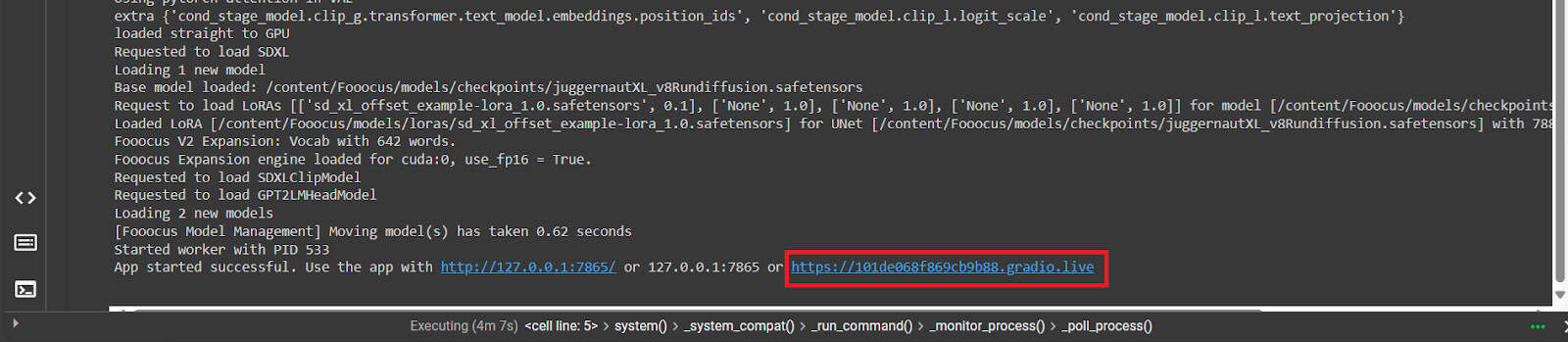 - Now, wait for the program to start. After the app has started, you will see a link as shown in the image below. Click on this link to start using the Fooocus app.