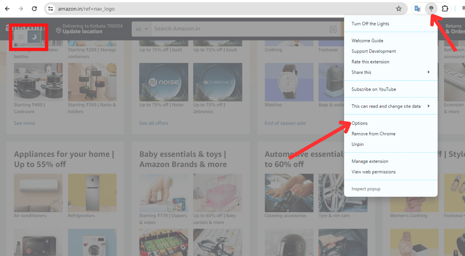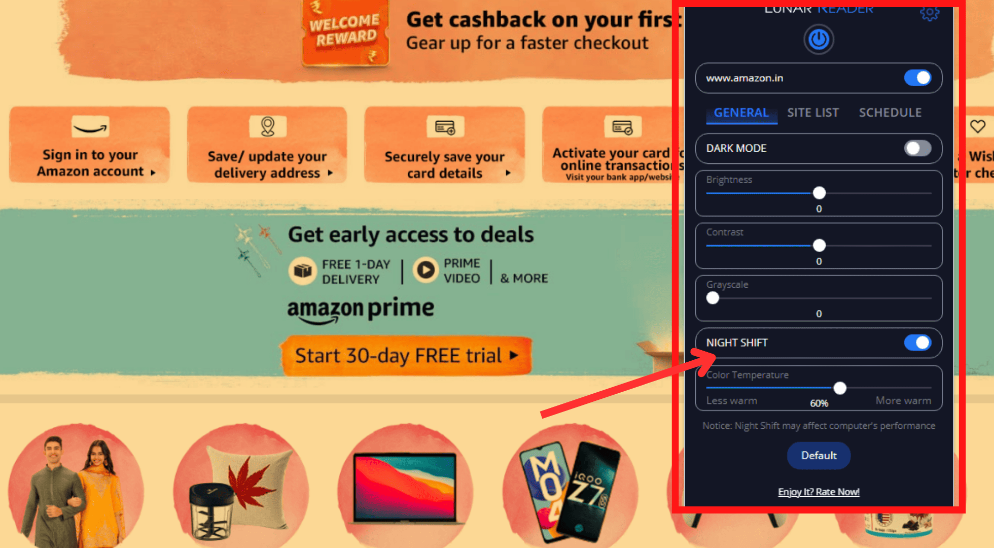 Wait, there’s more! The night mode feature provides maximum customization options, enabling night mode with a single click. To do so, right-click on the icon and navigate to the ā€˜options’ menu. For a more hassle-free experience, you can auto-schedule night mode at a particular time.
