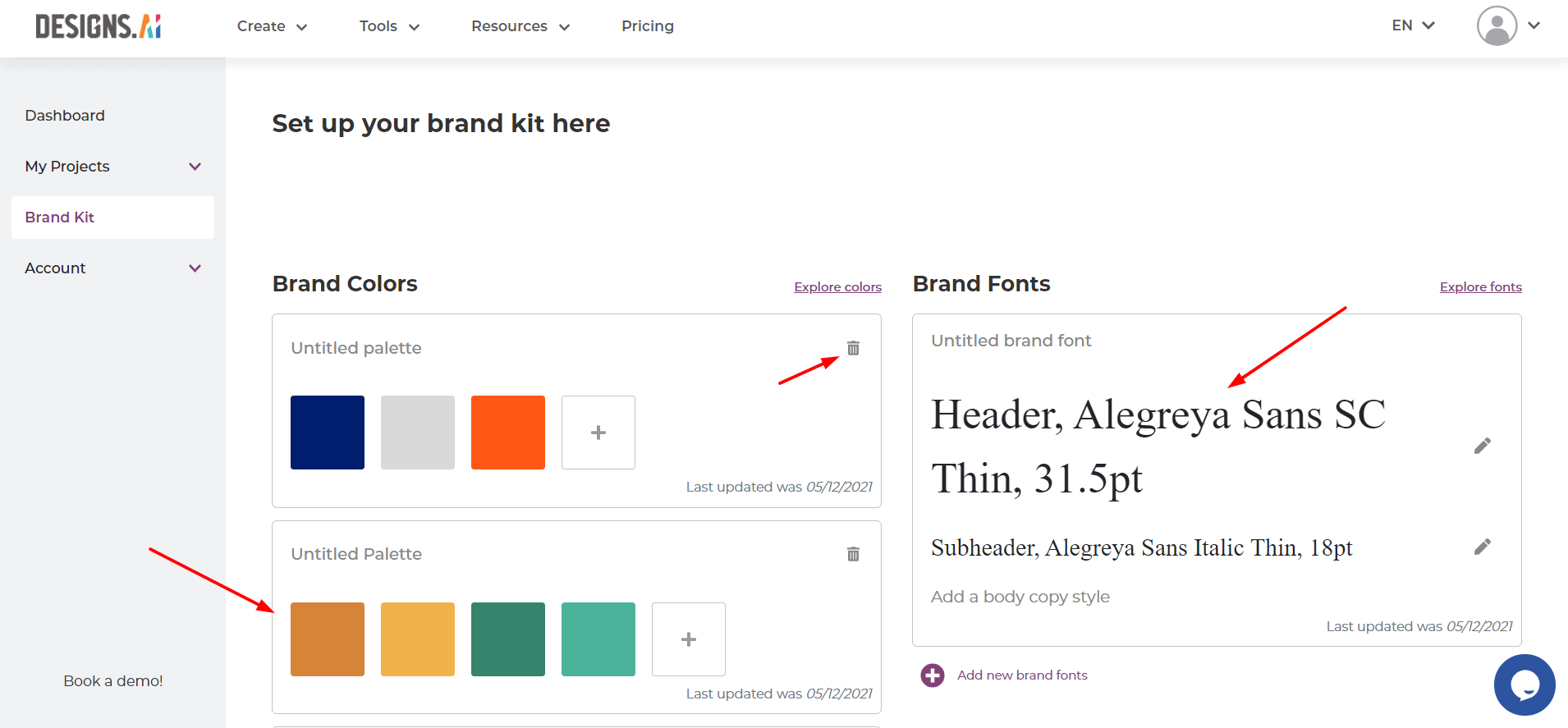 Designs.ai Brand Kit lets you choose your brand colors and add them to your palette. Alternatively, if you mark any color palettes from the Color Matcher as ‘favourites’, it will automatically add them in your Brand Kit. The Basic Plan lets you add up to 5 color palettes.