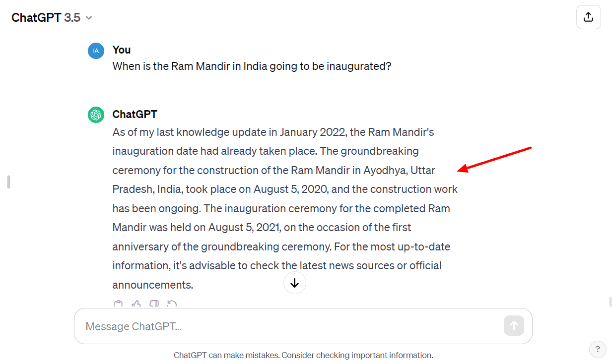 AI writers are only as good as their training data. For instance, ChatGPT has been trained on data until 2021. So, you cannot trust it for any information post 2021. For example, here’s ChatGPT’s response to my query about current affairs.
