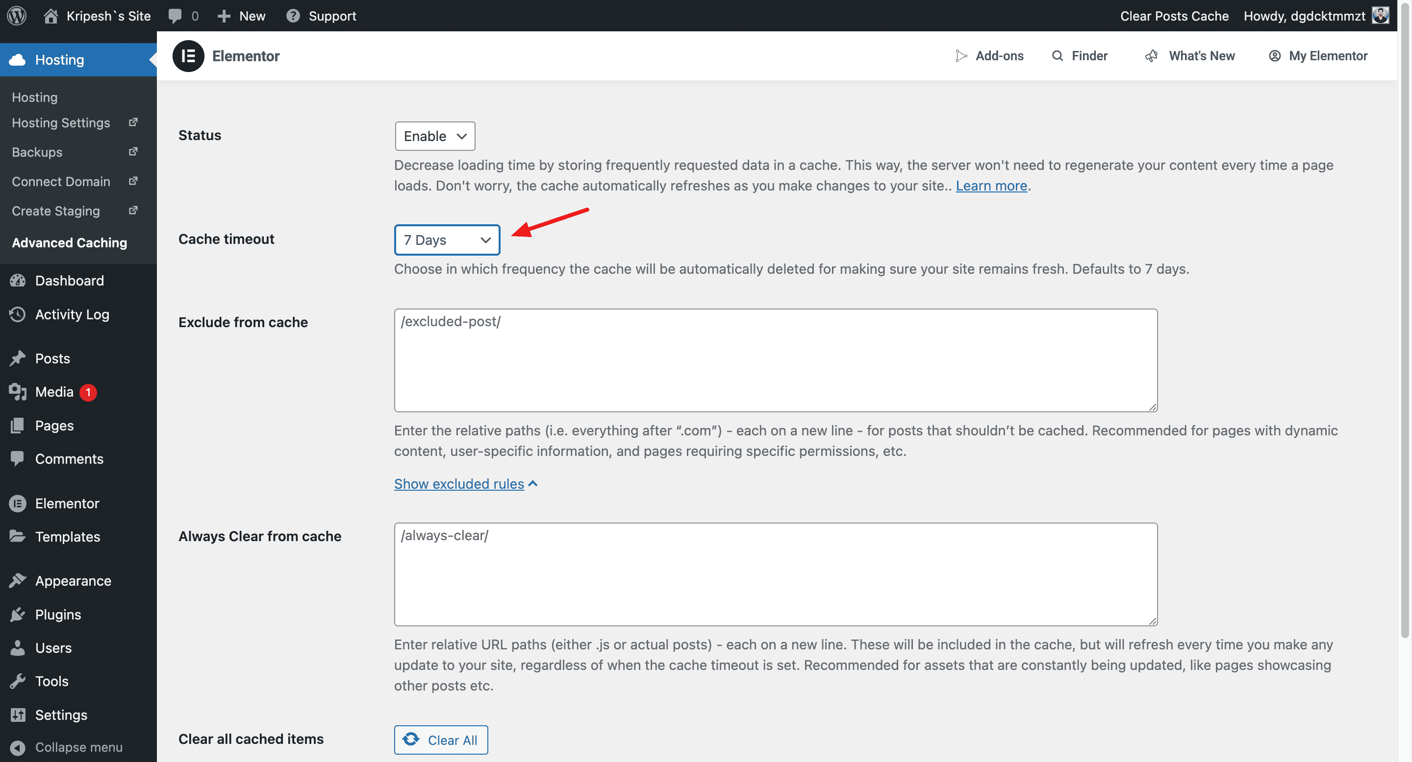 Elementor hosting comes equipped with its built-in cache system called Elementor Advanced Caching. It is available under the WordPress dashboard. You can set cache timeout from a range of 30 mins to 30 days.