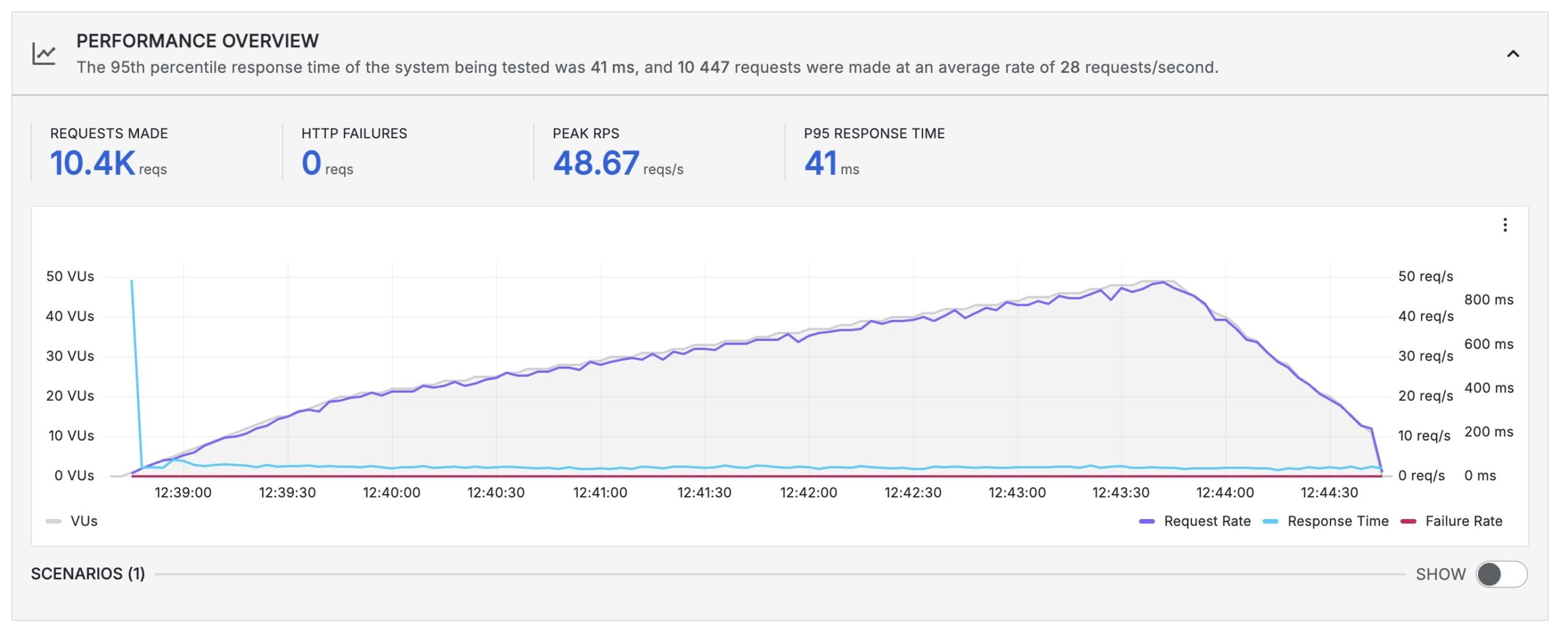 The peak requests reached 48.67 requests/second and the P95 Response time was 41 ms. (P95 Response Time is a metric that depicts the response time of 95% of the requests made to a system. Here, 95% of the requests had a response time of 41 ms or less.