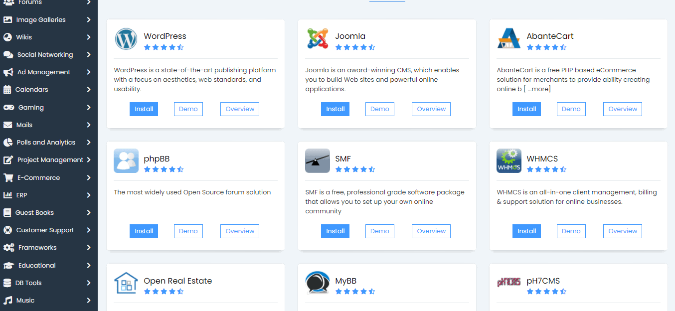 It also offers 300+ applications that you can install using the Softaculous auto-installer tool. You get apps for CMS platforms, blogs, social networking, eCommerce, file management, emails, gaming, and a lot more!