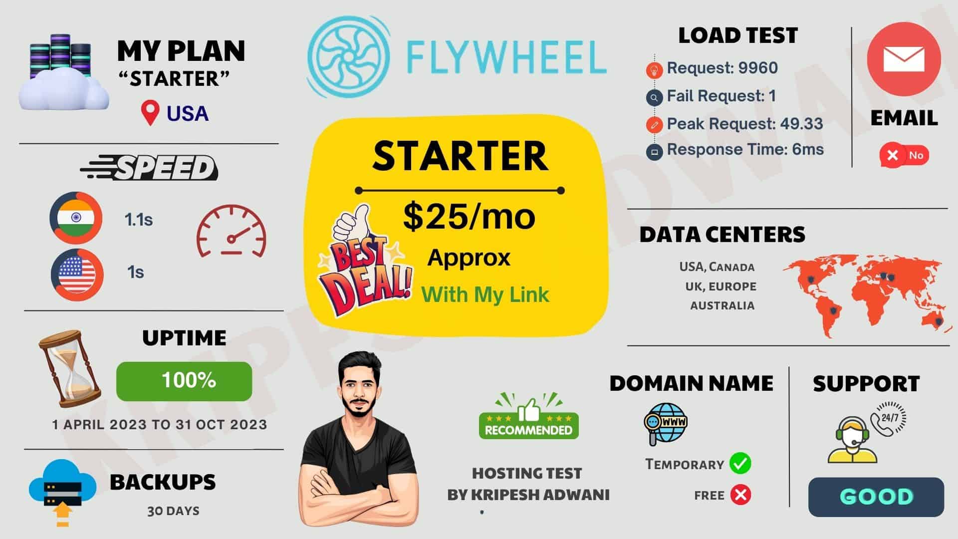 I’ve been using Flywheel hosting for the last 181 days. For monitoring its uptime, I’ve used the Better Uptime tool, which notes the uptime of my website every 30 seconds. The following table displays the uptime status report of the Flywheel WordPress Hosting Tiny plan (US servers).