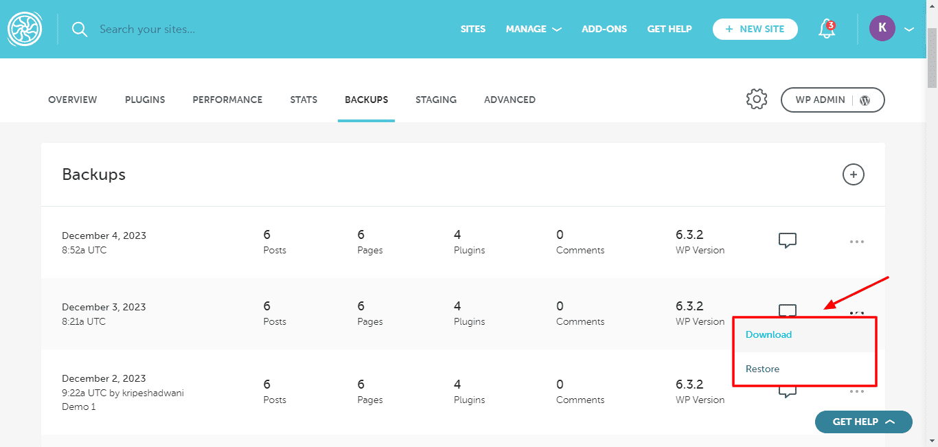 If you click on a website from the list, it shows you the overview of your domain, installed plugins, backups, website stats, etc. You can also log in to the WordPress dashboard, and manage collaborators, PHP version, email deliverability, databases, etc.