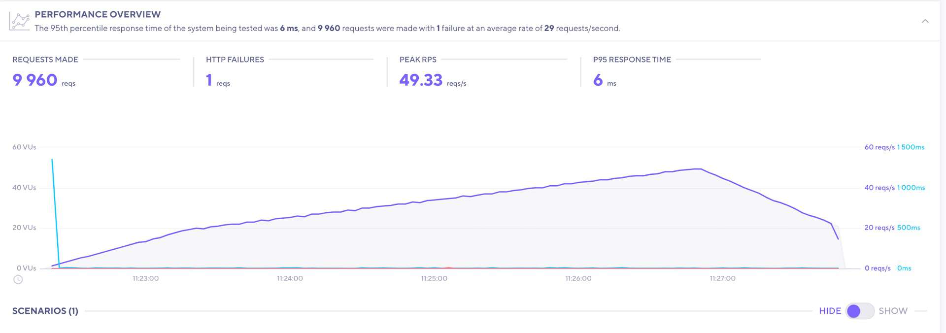 The peak response time reached 49.33 req/sec, whereas the P95 Response time was as low as 6 ms. This means that 95% of the requests had a response time lesser than or equal to 6 ms. There were no major spikes observed in the response time either.