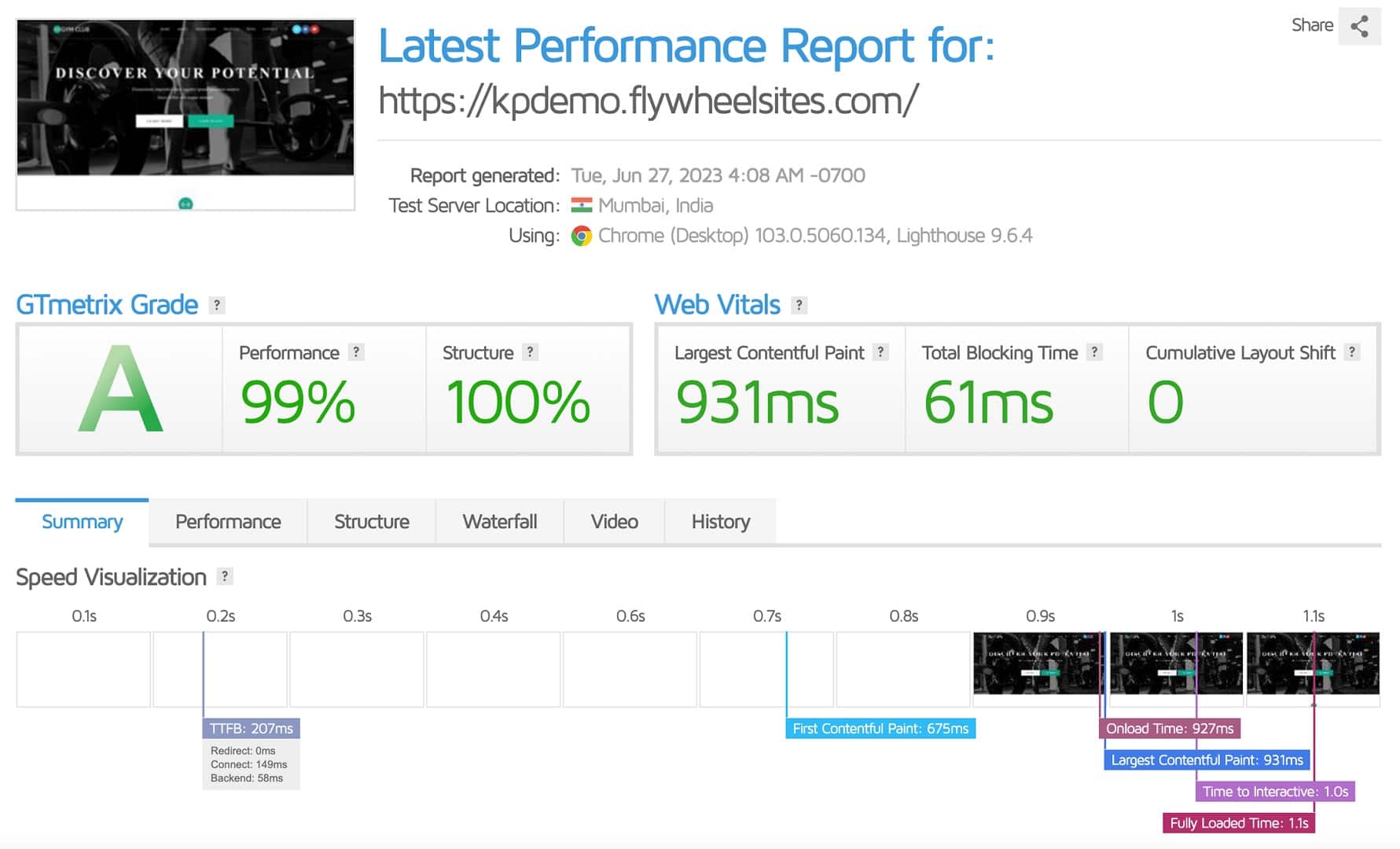Surprisingly, when I tested it from Mumbai, India, GTMetrix again reported an A grade score with 99% performance and 100% for structure. The Largest Contentful Paint was 931 ms, and the fully loaded time was 1.1 sec.