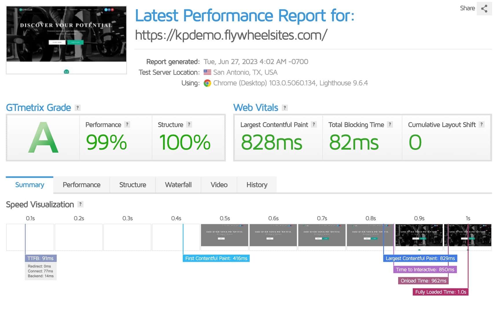 When I tested it from San Antonio, USA, GTMetrix reported an A grade score with 99% for performance and 100% for structure. The Largest Contentful Paint was 828 ms, whereas the fully loaded time stood at 1 sec.