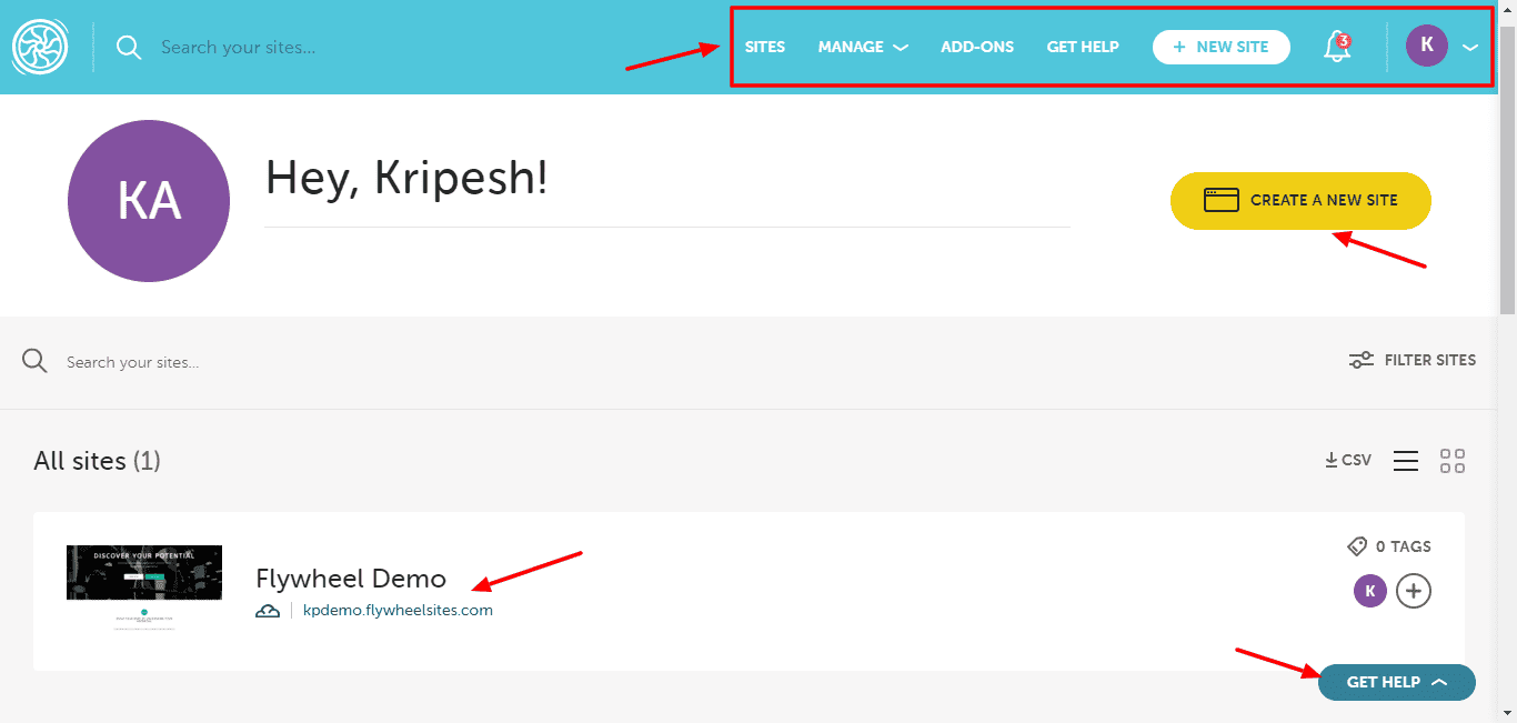 The user interface of Flywheel looks pretty neat and organized with a modern touch. The dashboard features a list of your active websites hosted on Flywheel. You can filter the sites, adjust the views, create a new site, and download a CSV file of your website.
