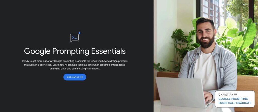 Google Prompting Essentials is an esteemed course offered by Google. It is hosted on Coursera and is designed for beginners with no AI experience. Taught by AI experts from Google, this course shares a 5-step prompting framework to generate effective outputs.