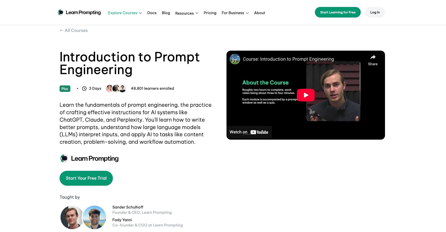 | Introduction to Prompt Engineering | LearnPrompting | Beginner | ~3 days | Paid |