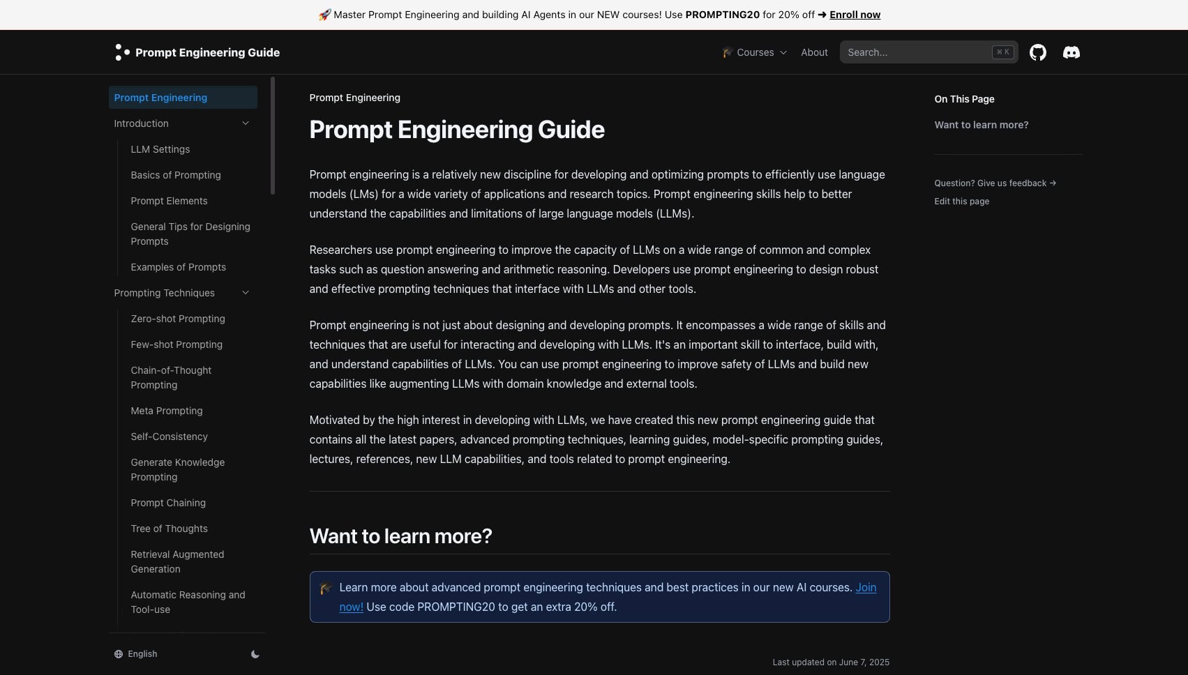 As is clear from the name itself, this is a prompt engineering guide by Elvis Saravia (co-founder of DAIR.ai). This is a text-based guide designed for intermediate-level learners and would take several hours to complete.