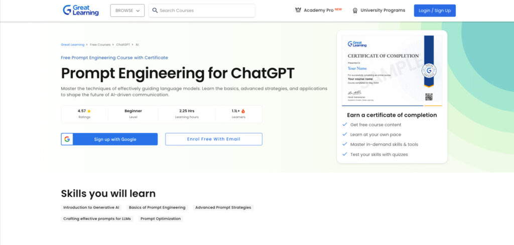 Prompt Engineering for ChatGPT is another free course offered by Great Learning. Focused towards beginners, it has garnered over 1.1 lakh learners and has a 4.57-star rating!