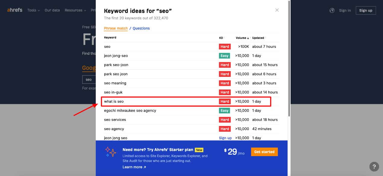 For your entered search phrase, Ahrefs recommends 20 keyword ideas along with search volume over the last 12 months and keyword difficulty. You can get matching phrase keywords, as well as the questions for the keyword.