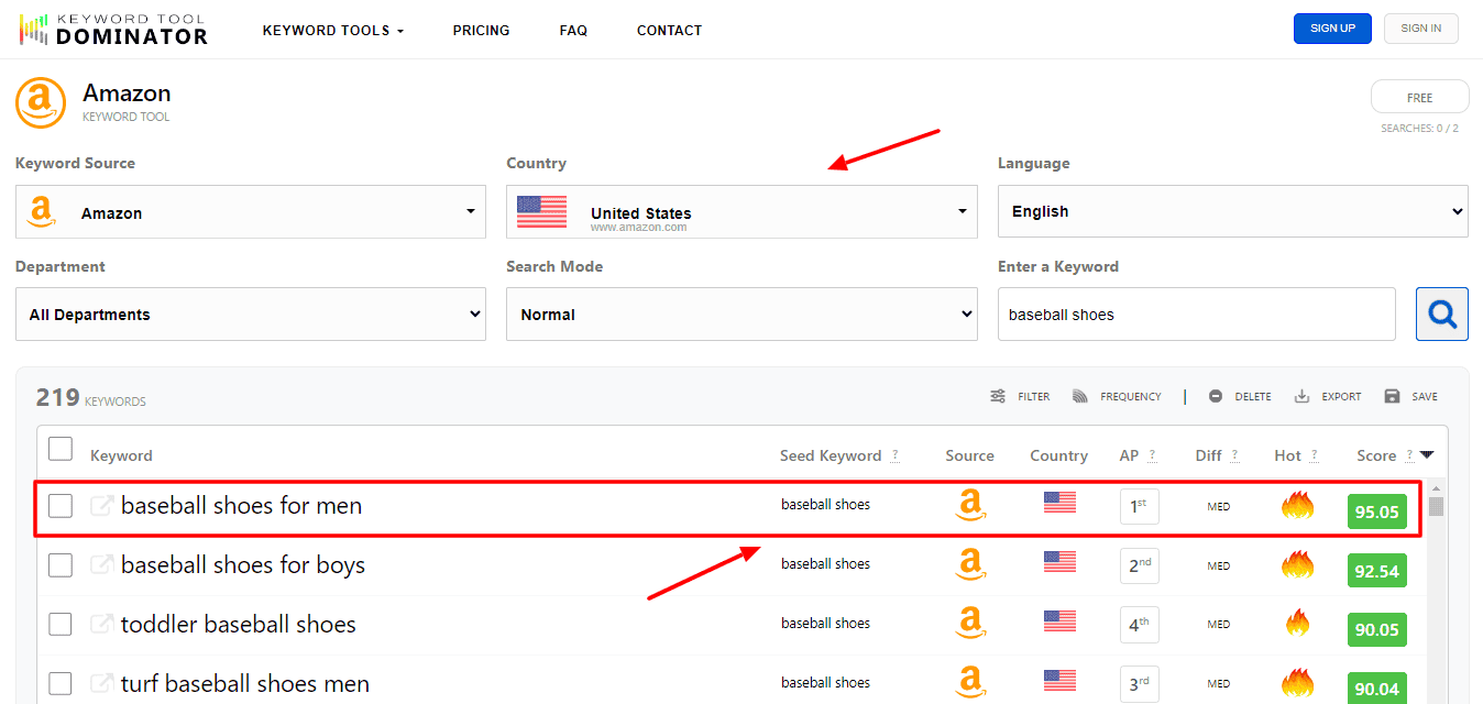 You begin by entering your primary keyword and target location. It fetches all the Google autocomplete suggestions for that term. For example, when I enter the keyword “baseball shoes”, I get a long list of 500+ long-tail keywords.