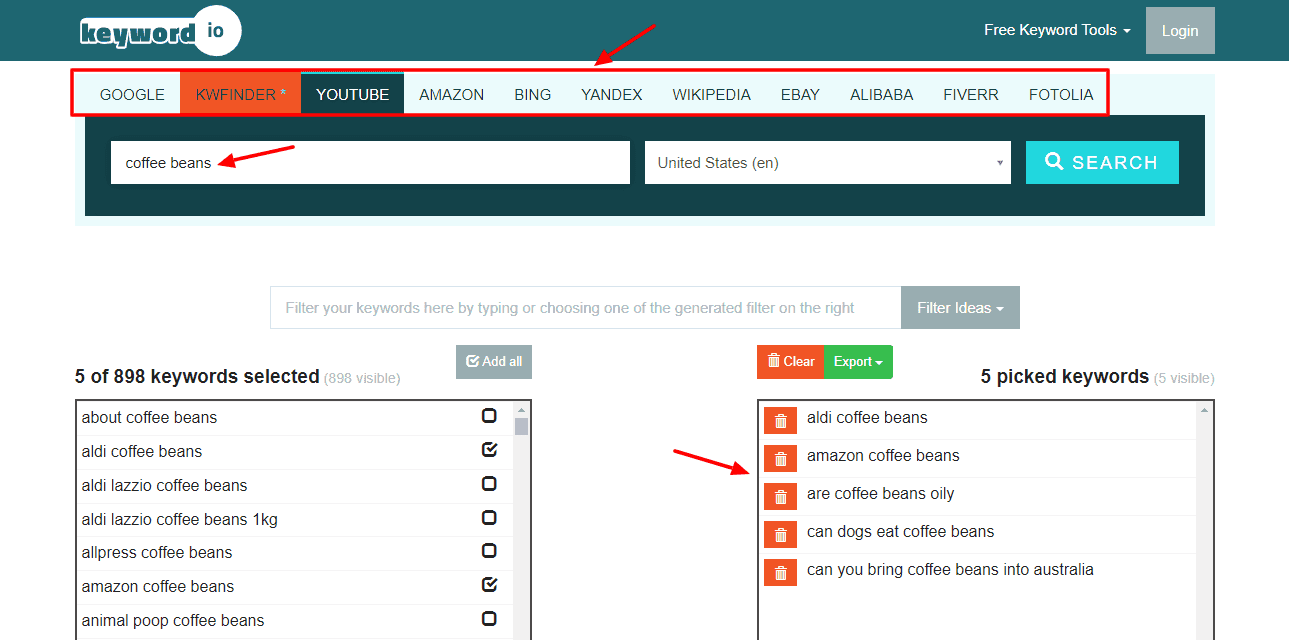 Along with the list of keywords, it also generates filters. You can select one of the terms to only view keywords from that category. Similarly, you can also perform keyword research for platforms other than Google, like YouTube, Bing, Amazon, Yandex, Fiverr, Wikipedia, etc.