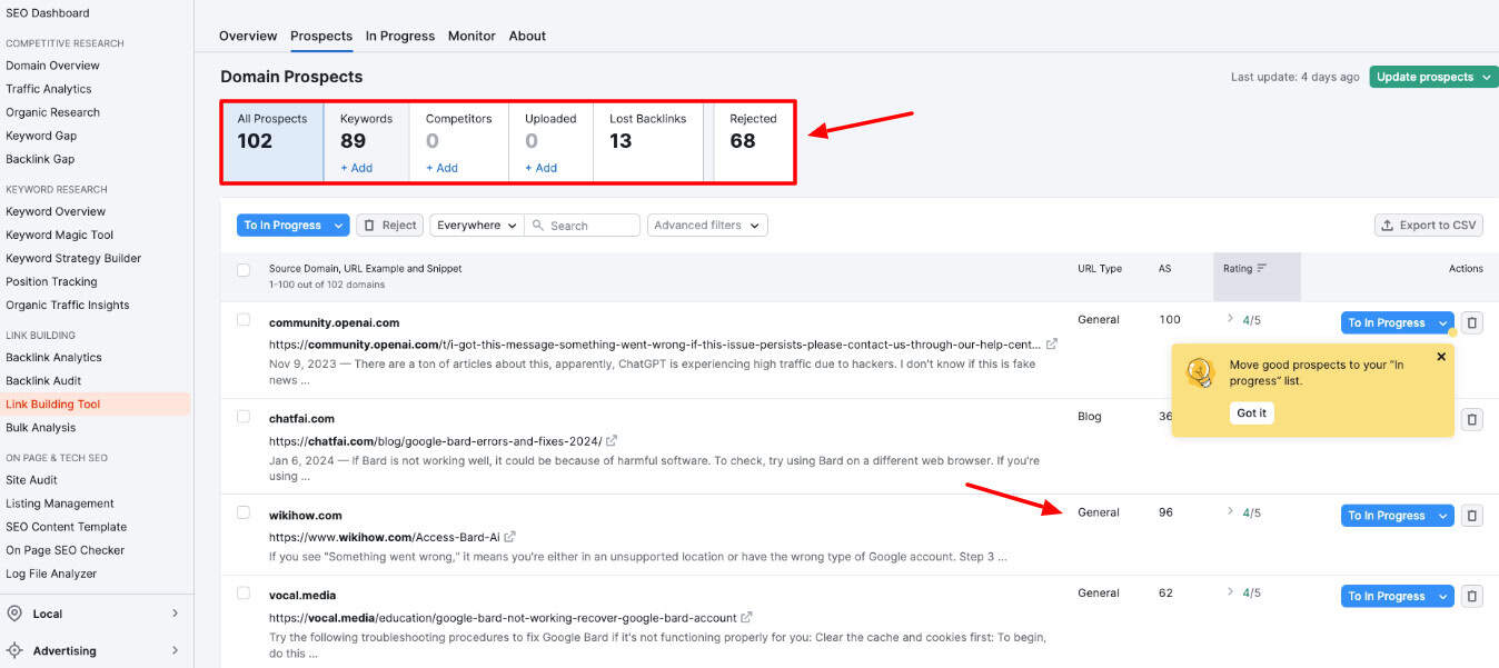 Finally, another additional feature of Semrush is Domain Prospects. Here, you can enter the keyword you want to rank for along with competitor domains already ranking for it. Semrush will fetch a list of all the potential pages from where you can get backlinks!
