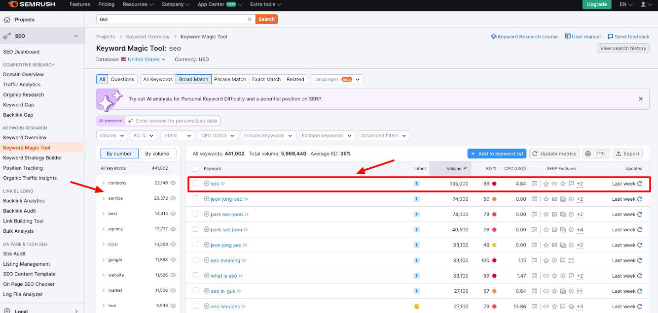 Another impressive feature of Semrush is its Keyword Magic Tool. It is available on the free plan as well. It gives you the list of the best keyword ideas for your seed keywords, along with volume, keyword difficulty, CPC, intent, and more.