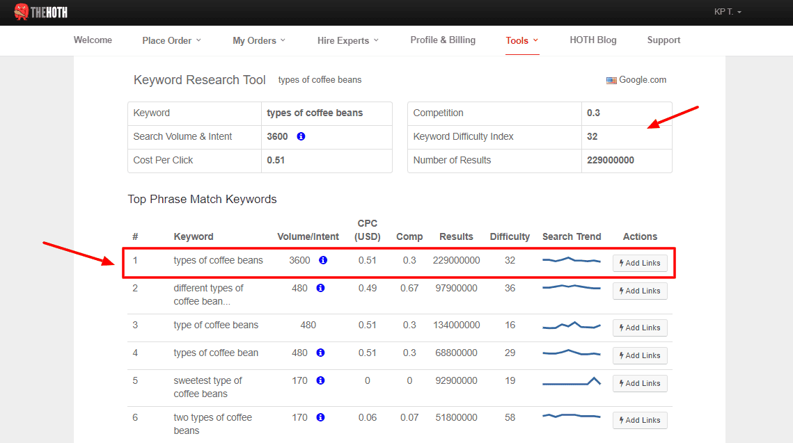 - Though this tool is free, you only get volume and keyword difficulty through keyword research. It hides advanced data like CPC, DA, PA, and minimum backlinks required.