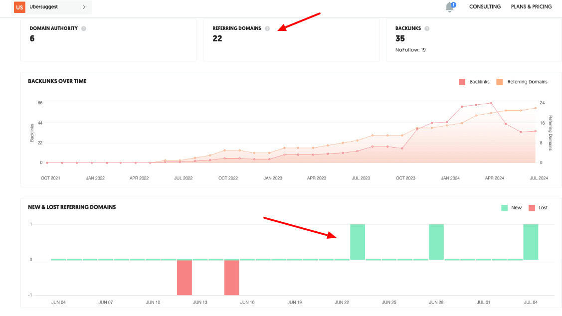 Besides the tools mentioned above, Ubersuggest also features the backlink overview tool. It helps you get the backlink profile of your competitors. You get graphical representations of domain authority, referring domains (lost or gained), and backlinks.