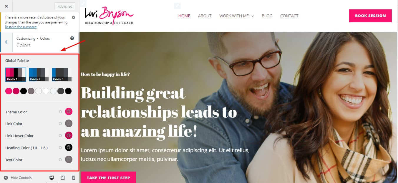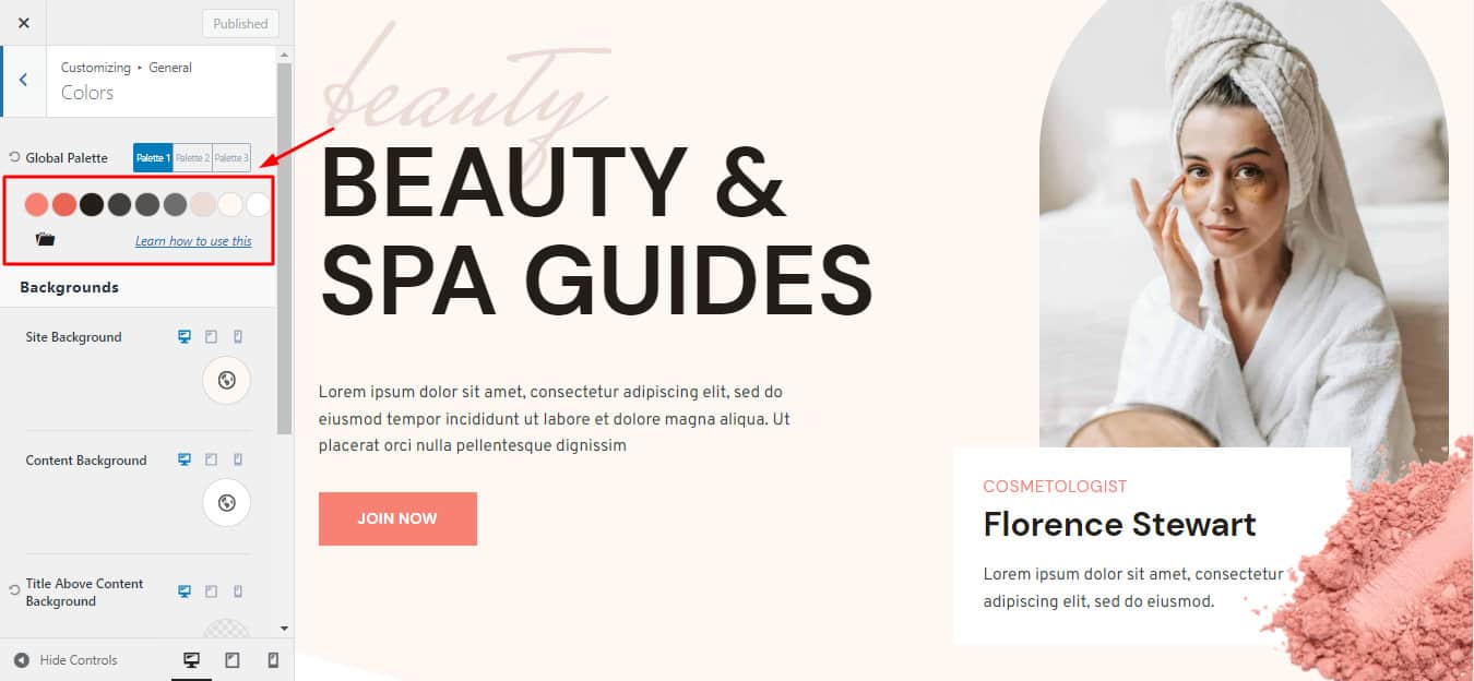 It comprises a palette of the primary colors used throughout your website. With a single click, you can switch any of those colors with a different one.