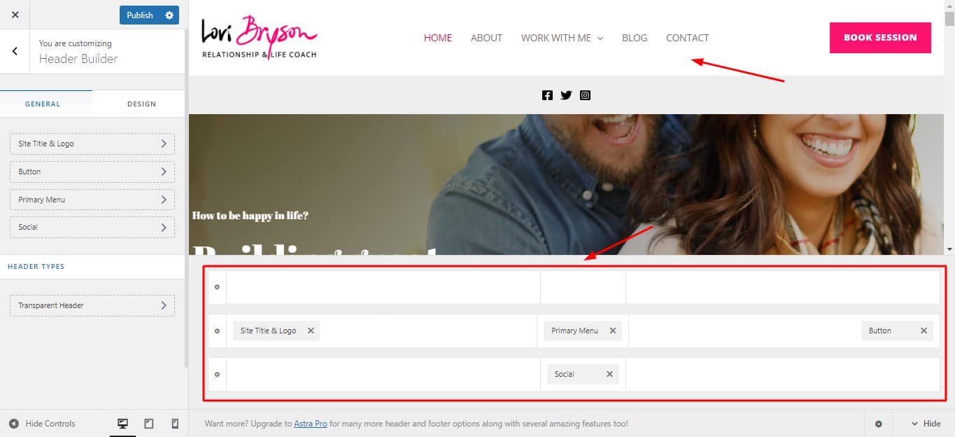 You get a well designed header and footer builder with Kadence. It features a 3 x 3 matrix of blank spaces where you can drag-and-drop elements and adjust them with ease.