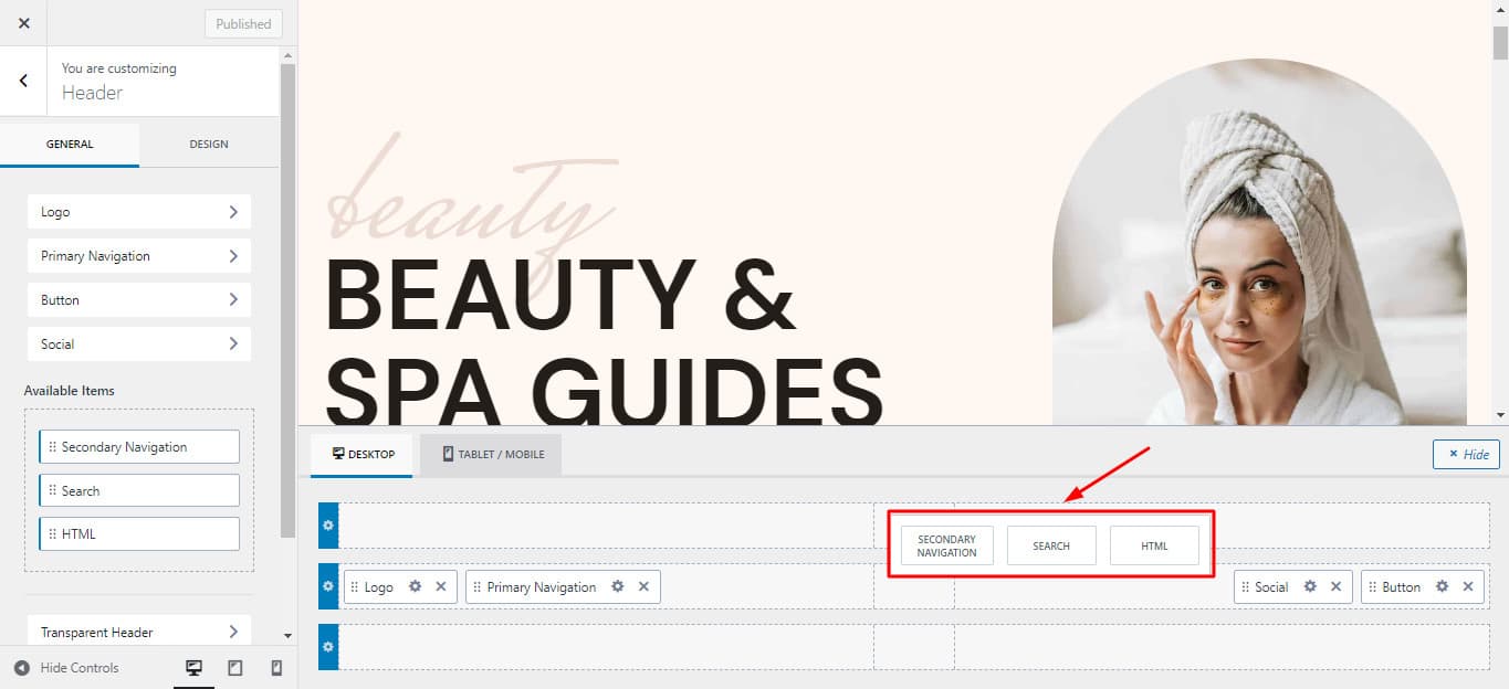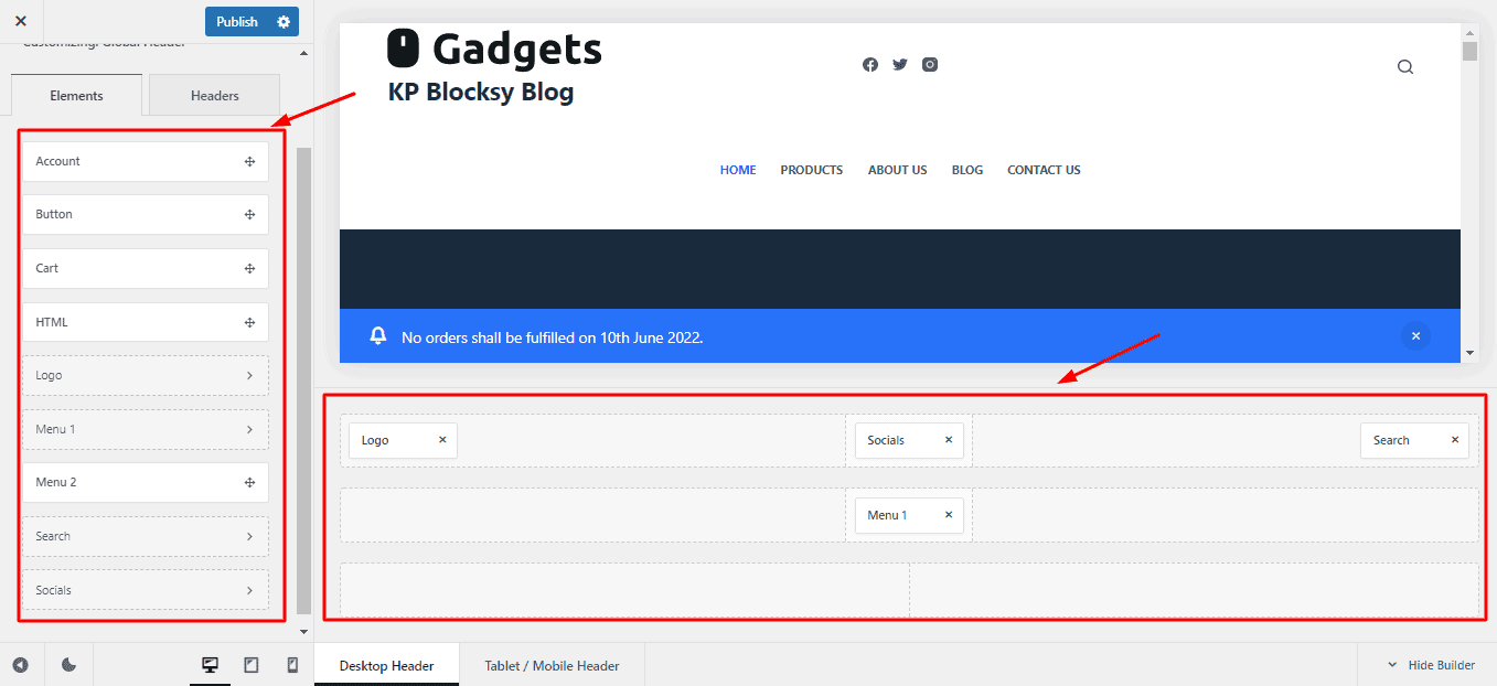 Header and Footer builders are displayed in the form of a 3 x 3 matrix. You get 9 widget elements that can be dragged and dropped onto the header or footer columns.