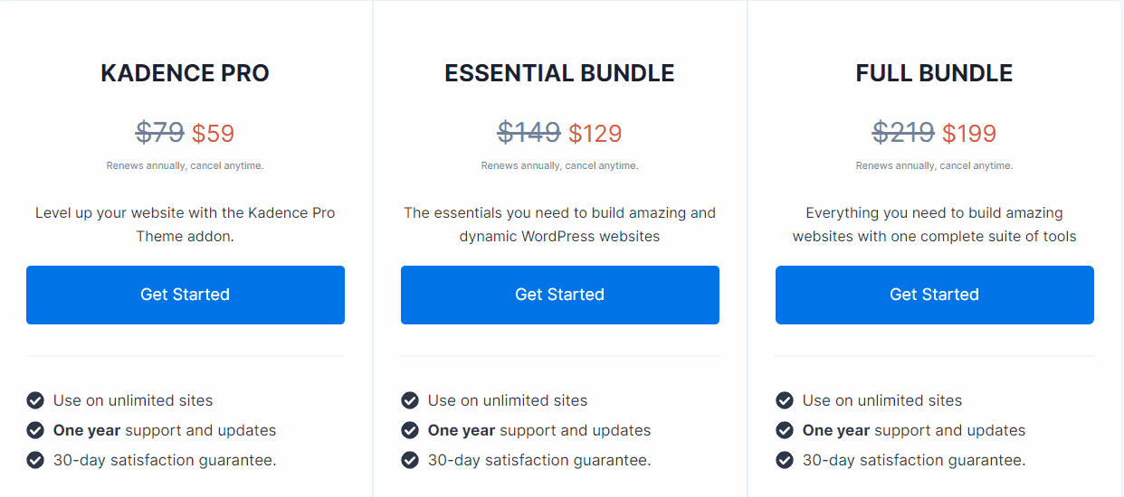 Kadence features three different plans including Kadence Pro, Essential Bundle, and Full Bundle.
