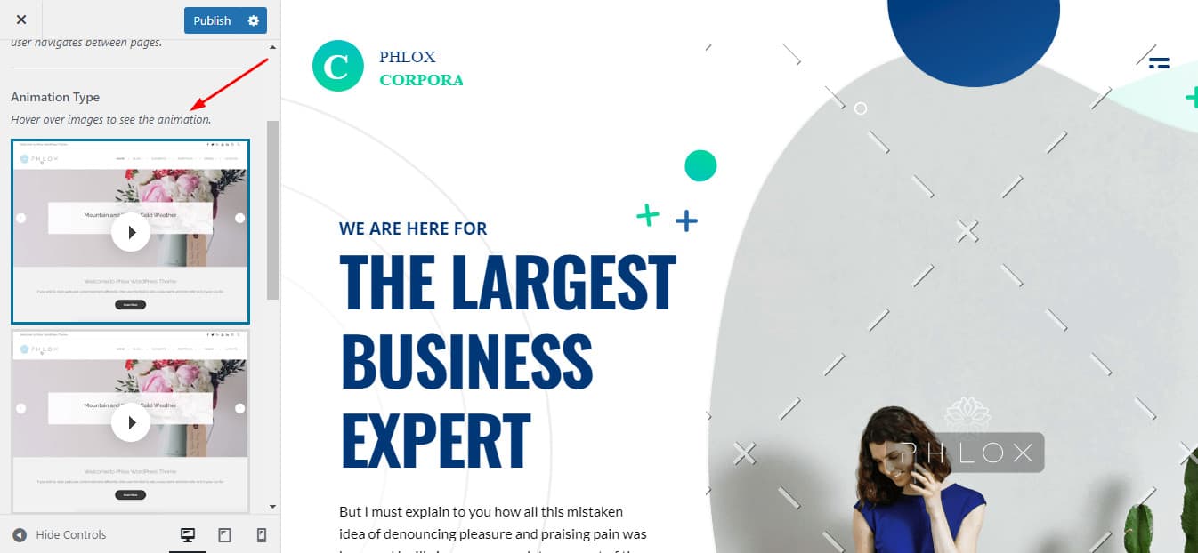 The most attractive feature of Phlox is its page animations. It adds a lively touch to a static webpage. You get 4 different animations with the free plan, including Fade, Cover, Circle, and Slide Up.