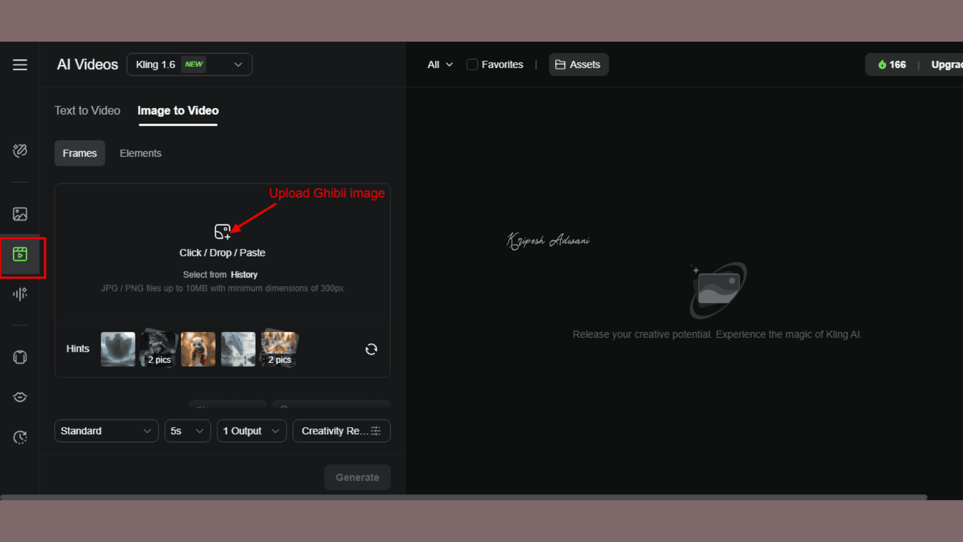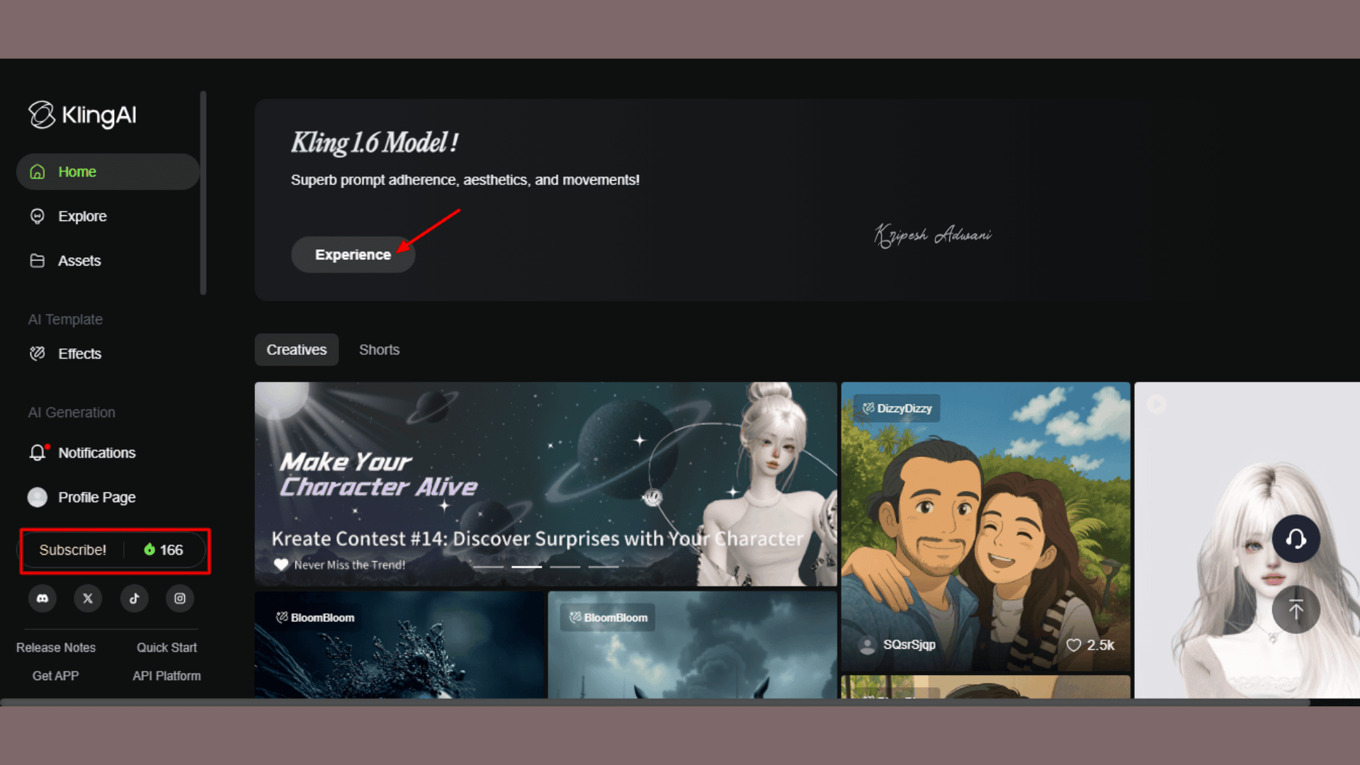 Visit the Kling AI official website and sign up for a new account. You can use your Gmail or any other email ID to create an account. Once logged in, you’ll see 166 AI credits displayed on the left side of the home screen.