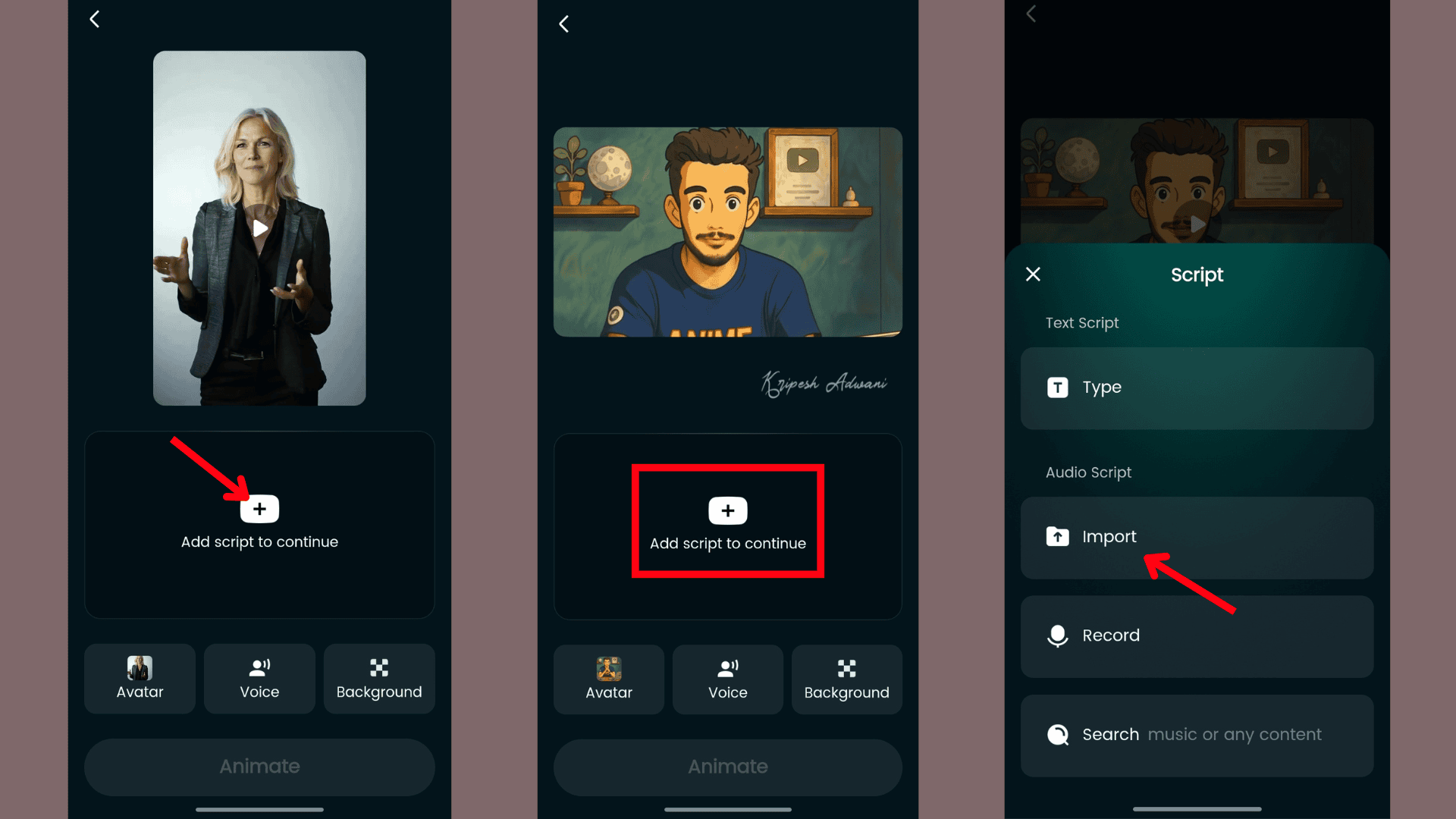At this stage, tap on “Avatar” and upload the animated video you created earlier. Then, click “Add Script to Continue” and import your audio file. If you don’t have a personal voiceover, you can use an AI Voice Generator to create one.