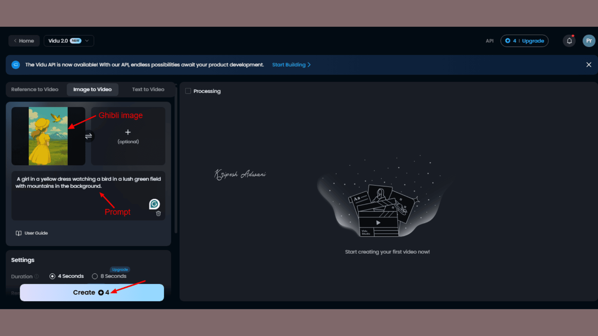 Vidu AI is the simplest video generator among all the tools reviewed above. It allows you to create an animated video from a Ghibli-style image for free.