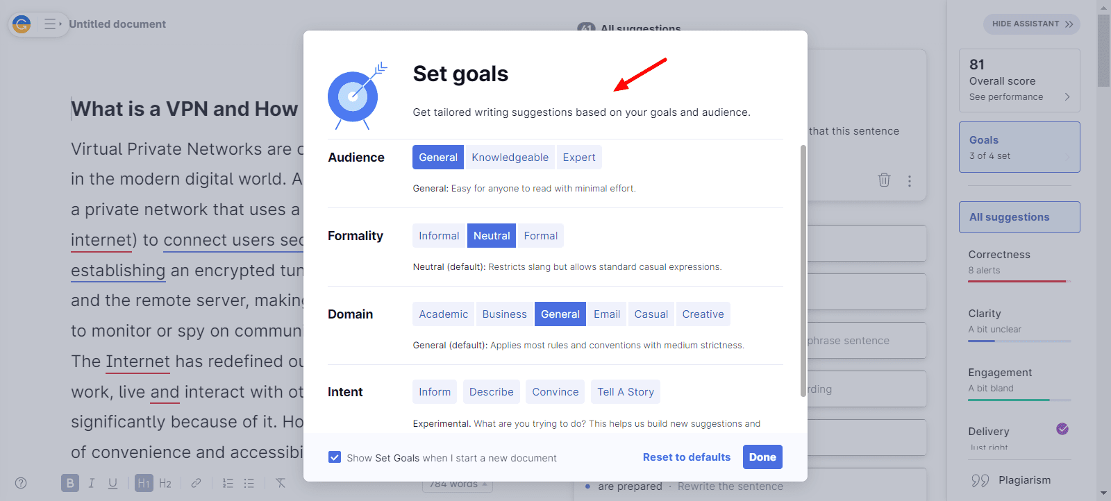 In Grammarly, you are asked to set editing goals for your document as per the following 4 criteria: