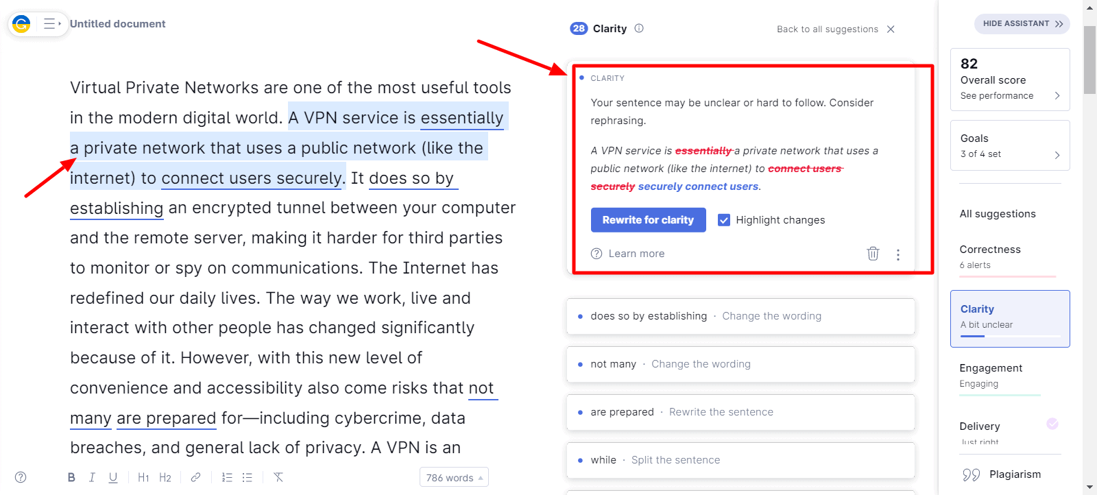 Under the Clarity tab in Grammarly, you will find suggestions to make your content easier to read and more clear for your audience. This includes changing the wording of the used phrases or rephrasing the sentences entirely.