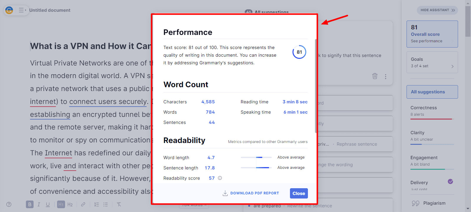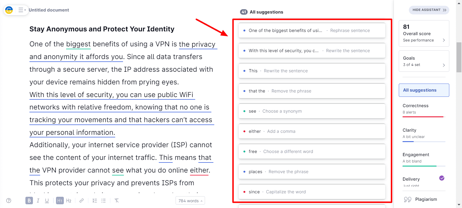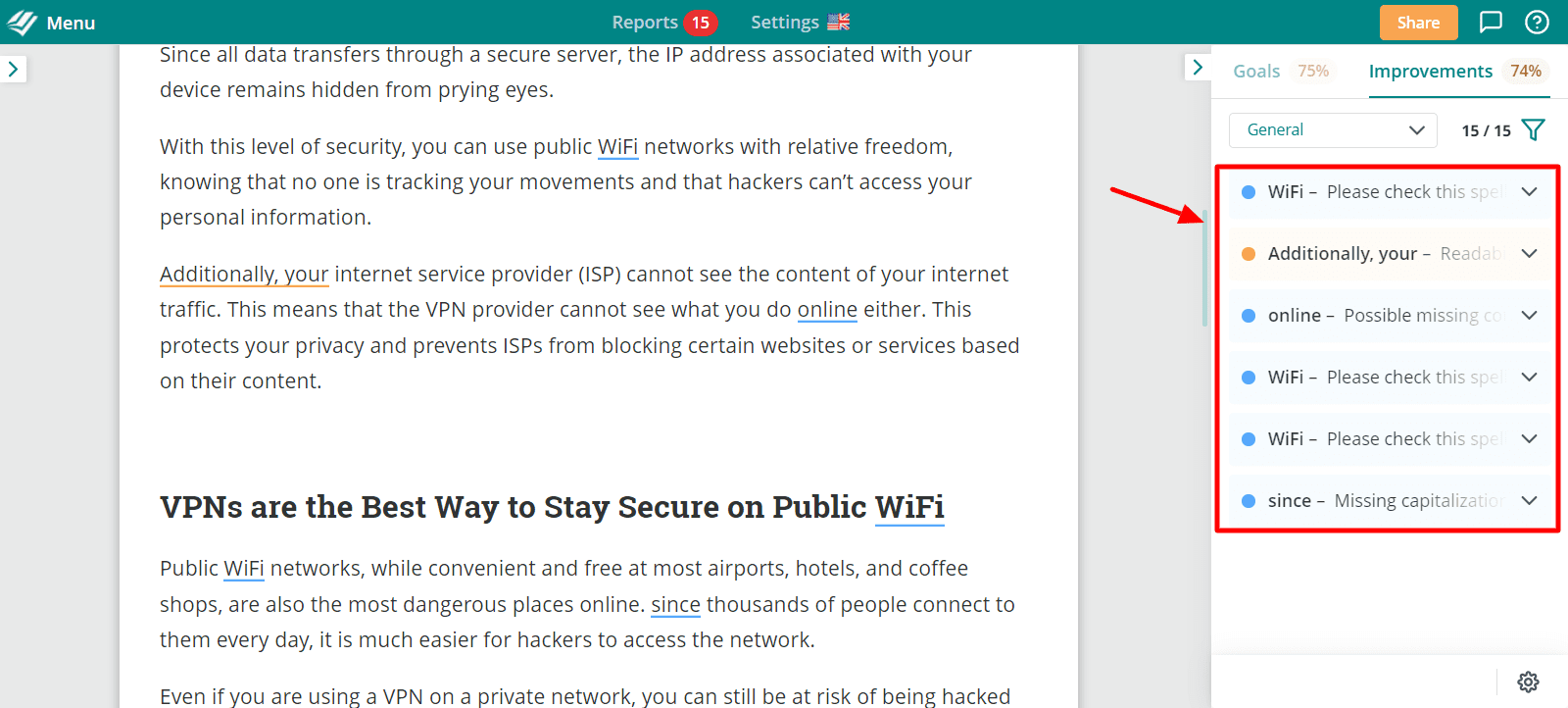 To compare both these tools, I have used a 750-word document on the topic āVPNā. With this content, we will try to understand the type and quality of suggestions offered by both tools. So, letās begin.