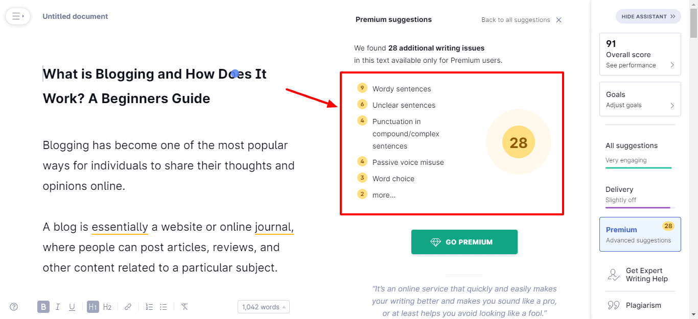 Their Premium plan gives you access to advanced grammatical suggestions, Tone Suggestions, Full Sentence Rewrites, and unlimited Plagiarism Detection.