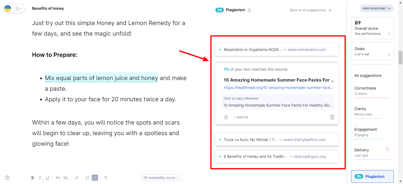 Because Grammarly does not have a report-based system, it shows all the suggestions found throughout the document on the right side of the editor.